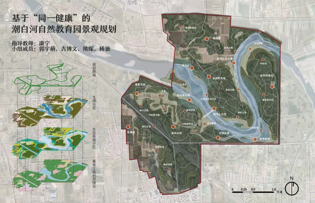 清华大学组《基于“同一健康”的潮白河自然教育园规划》在恢复湿地与森林复合生态系统完整性与连通性基础上,通过鸟类生境营造促进场地生物多样性保护,并将绿色疗愈与自然教育相融合,增效实现区域生态系统服务、生物多样性和公众的“同一健康”。