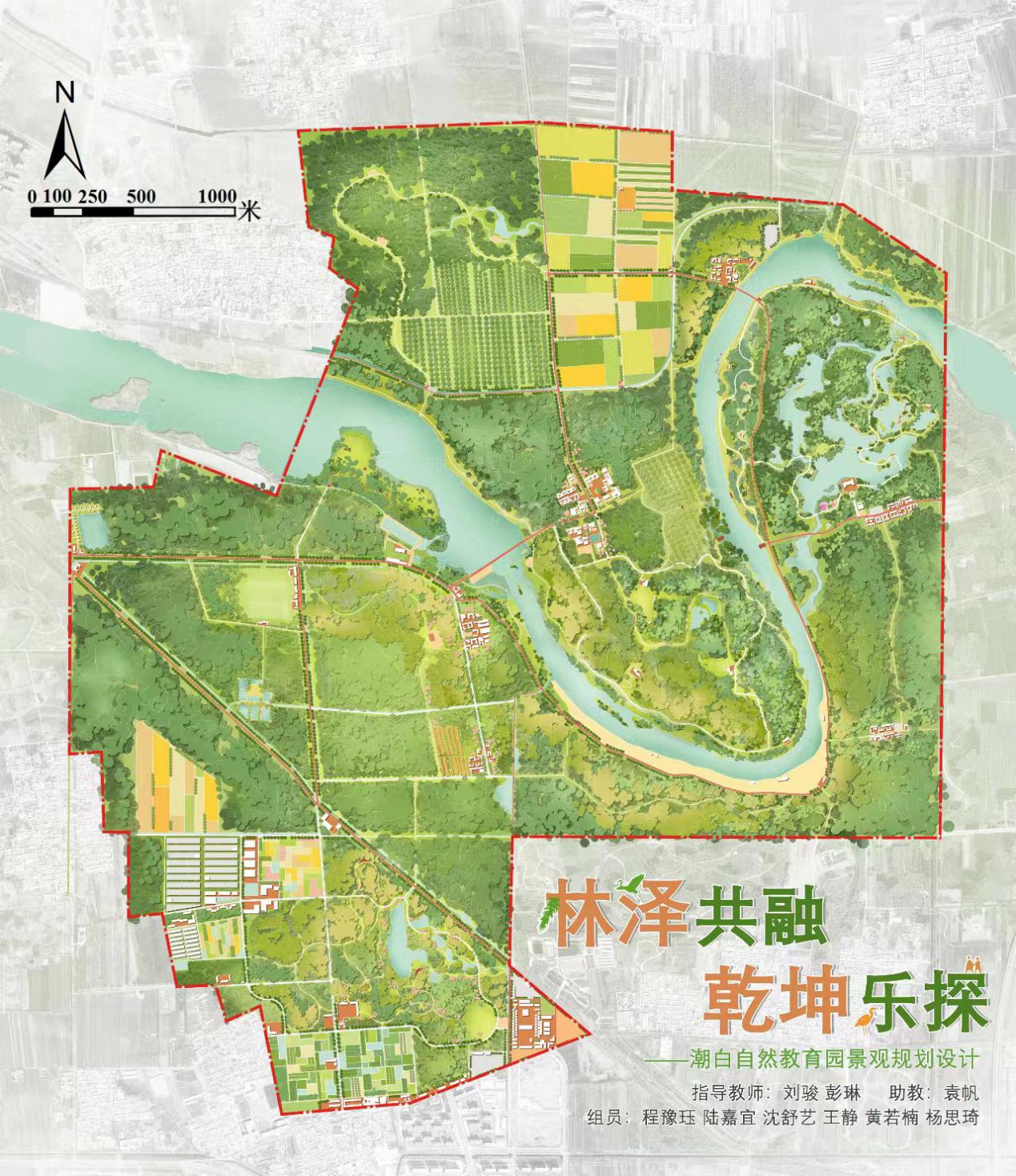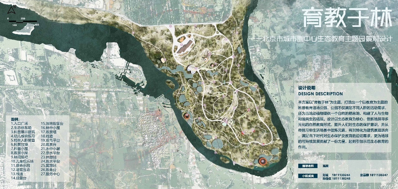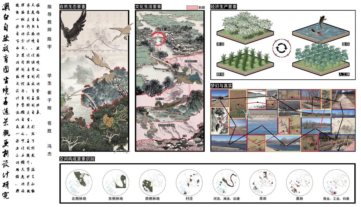 重庆大学组《林泽共荣,乾坤乐探》以“林泽共融,乾坤乐探”为主题,打造集生态保护、自然教育、休闲观光等功能于一体的潮白自然教育园。通过水网系统营建、水域生态系统修复、人工林近自然化改造、农田生境塑造等生态优化措施保护自然基底,提升场地内生物多样性;并在此基础上,充分利用“乾坤湾”、“河湾湿地”、“平原森林”等特色资源,开展“关于自然”“在自然中”“为了自然”的教育活动,使游人在体验阆苑林泽美景的同时探索自然乾坤的奥秘。