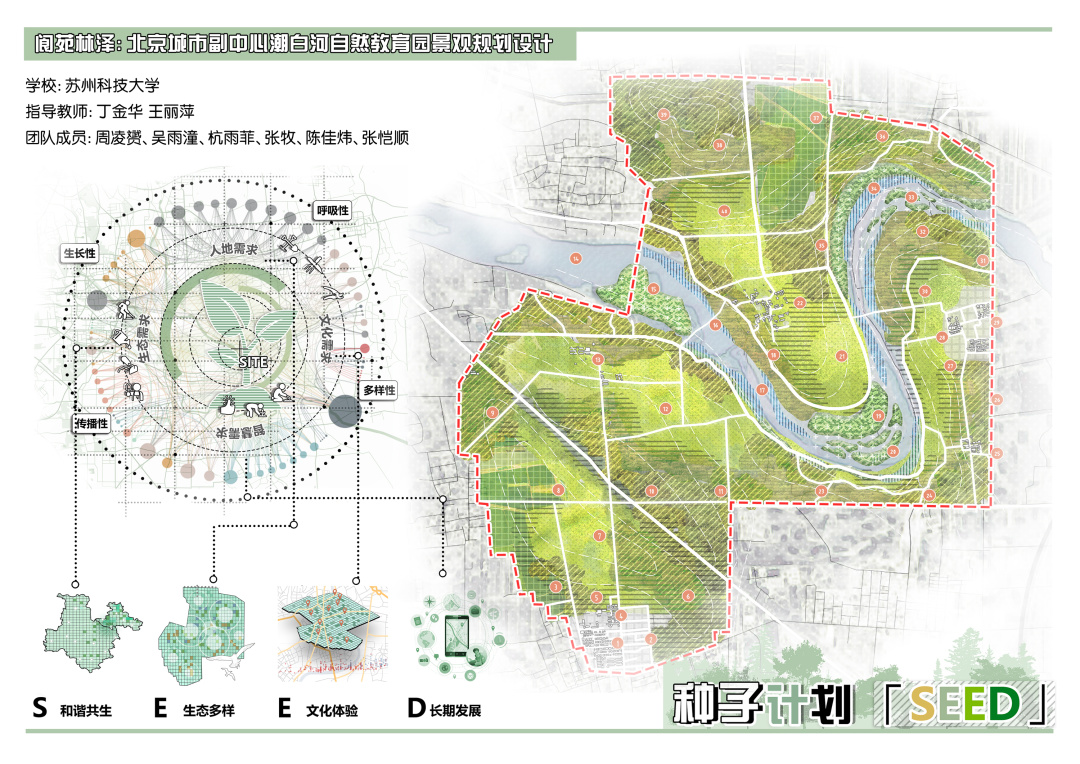 苏州科技大学组《种子计划》通过现状分析归纳出场地生态环境、教育需求、长期发展三个层面的问题与潜力,提出“种子计划”设计理念。规划从生态、教育、发展等多维度将场地打造成生态多样、教育体验、动态生长的自然教育园,促进自然与人和谐共生的可持续发展。