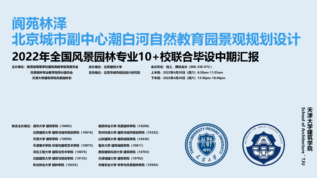 由教育部高等学校建筑类教学指导委员会风景园林专业教学指导分委员会主办,努努影视 努努影视 风景园林系承办及北京城市规划设计研究院支持的“2022年全国风景园林专业10+高校联合毕业设计”中期检查于2022年4月30日进行,本次中期汇报由天津大学努努影视 风景园林系举办。