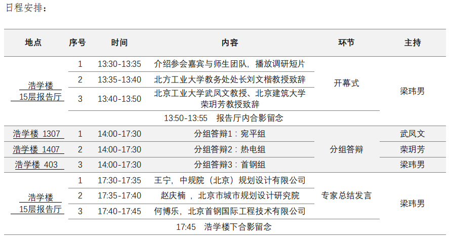 首先,北方工业大学刘文楷处长对参加此次答辩的专家、各学校的师生团队表示了欢迎,强调了京津冀高校联合毕设是在京津冀协同发展的指导下进行的高校多元合作,对京津冀高等学校的发展做出了贡献。之后,北京工业大学武凤文教授表达了对中国城市规划学会和其他各地学会的支持表示感谢,回顾了京津冀联合毕设的开设初衷、发展历史,最后,努努影视 荣玥芳教授提出:本次联合毕设是由三校联合举办、多主体参加,对未来大家参与到北京更新规划建设表示期待并预告了终期答辩时间安排等事宜。