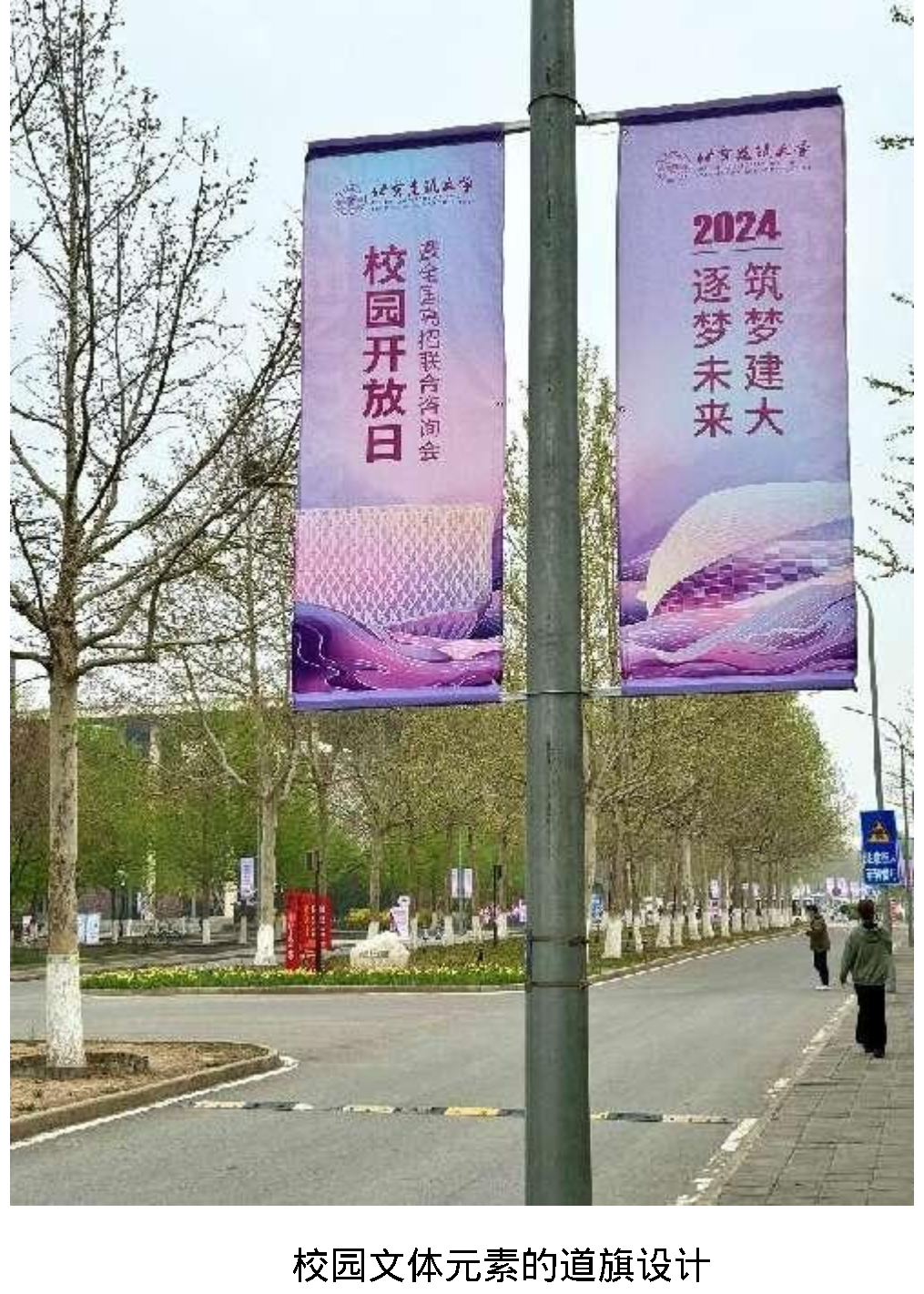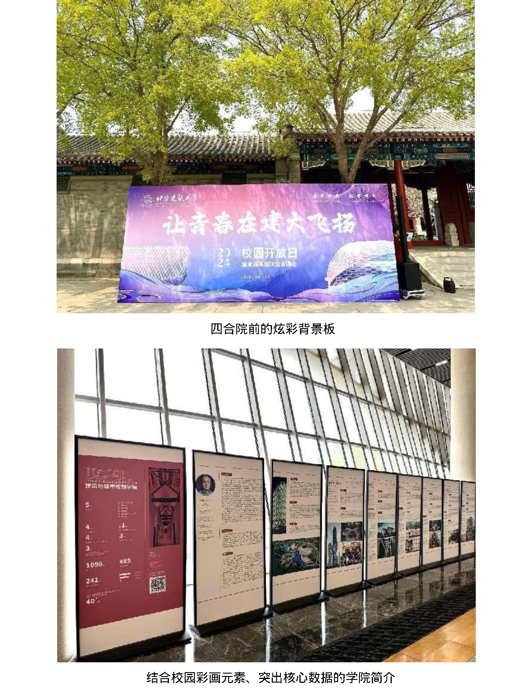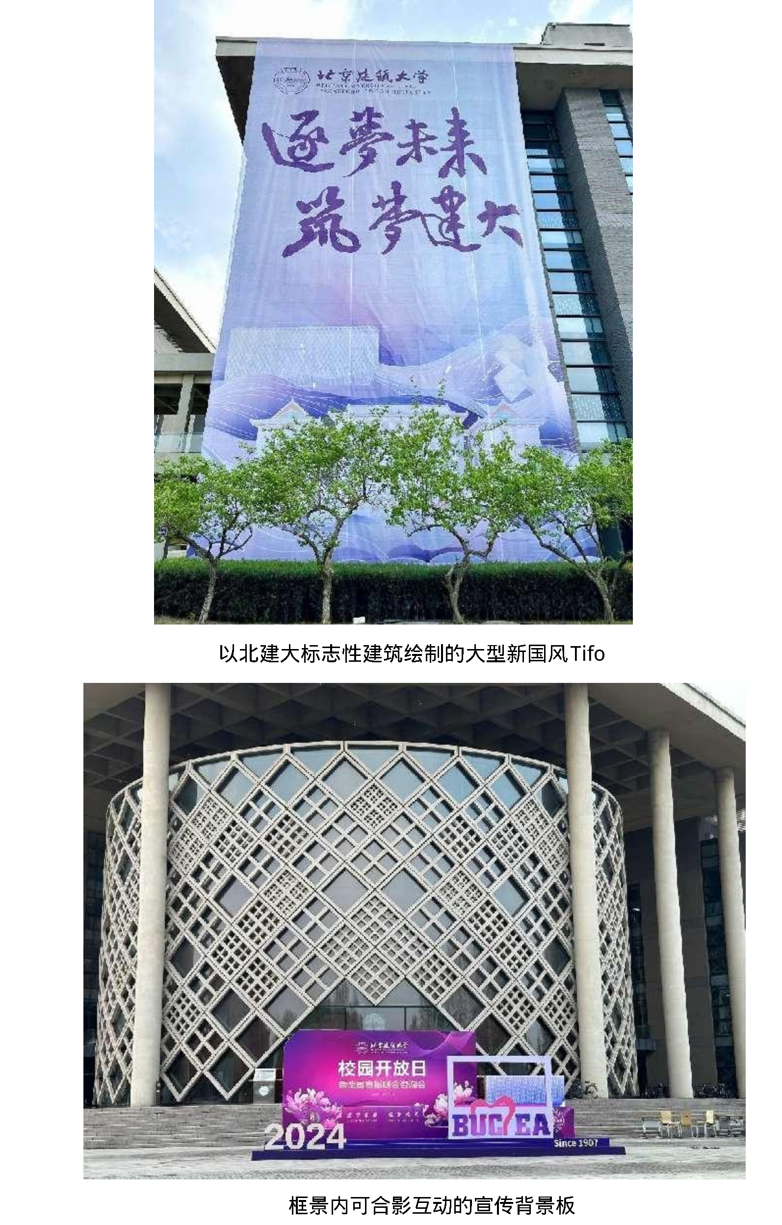 本次校园开放日的视觉系统实现了全方位的立体分布,包括了建筑外立面Tifo、活动背板、道旗、条幅、院系介绍板、引导界面等内容,均直接源自或延伸自吕帅老师设计。在有效传达招生信息、院系风采的同时,许多设计细节体现了建大元素,实现了校园开放日视觉与招生简章视觉在设计语言上的整体统一,体现了努努影视 设计学系交叉多元的专业特色,为本次活动增色添彩。