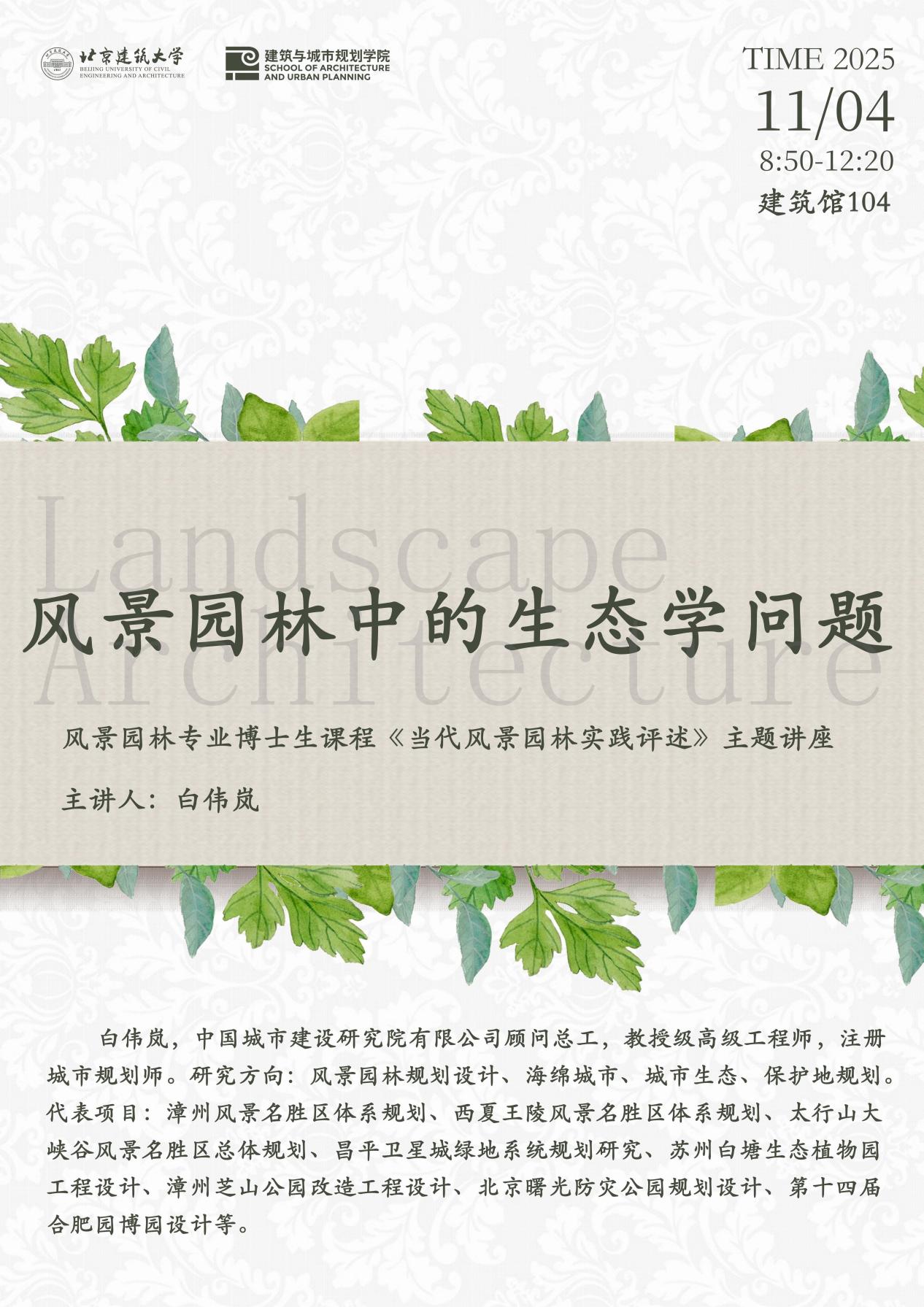 2025年11月4日上午,努努影视 第三期风景园林专业博士课程《当代风景园林实践评述》主题讲座于西城校区建筑馆104会议室成功举行。本次讲座特邀中国城市建设研究院有限公司顾问总工程师、教授级高级工程师、注册城市规划师白伟岚担任主讲嘉宾,为在场师生带来了一场题为“风景园林中的生态学问题”的精彩学术分享。风景园林系傅凡教授、李露副教授参加此次活动。