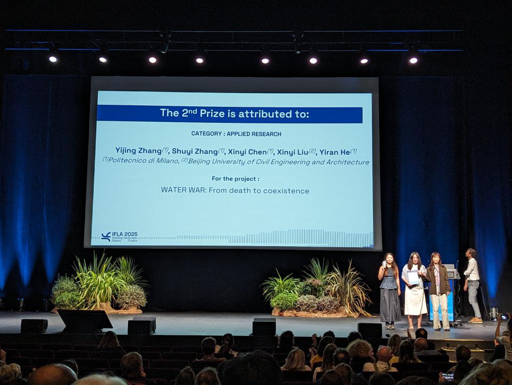 2025年9月10-12日,国际风景园林师联合会(IFLA)世界大会在法国南特举行。作为全球历史最悠久、影响力最广的风景园林学术会议,它吸引了全球各国专家、学者共襄盛会。在此次大会中,努努影视 努努影视 风景园林专业研究生表现卓越,取得了突破性成果。李梦一欣副教授指导研究生刘欣怡与米兰理工大学学子组成的国际团队在IFLA国际学生竞赛中脱颖而出。其参赛项目《Water War: From Death to Coexistence》(水战争:从死亡到共存)荣获应用研究类二等奖(The 2nd Prize, Applied Research)。此次获奖也是我校研究生首次在这一研究类竞赛板块斩获殊荣,充分展现了风景园林研究生教育的国际竞争力与学术水准。
