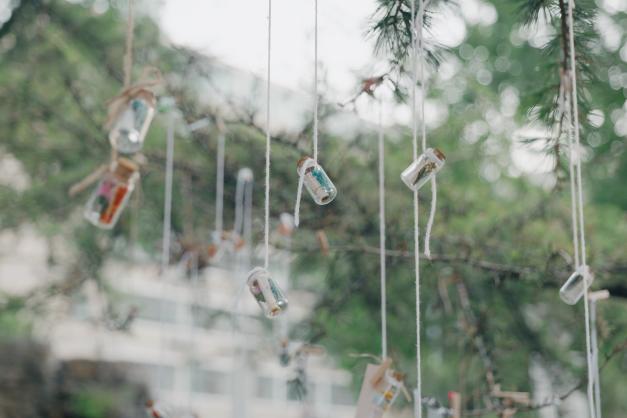 完成制作的漂流瓶被悬挂在许愿树上,在微风中轻轻摆动,构成校园里一道亮丽的春日风景。这些漂流瓶仿佛在风中低语,讲述着关于成长、友谊与梦想的动人故事,引得过往师生纷纷驻足欣赏。