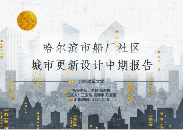 本年度联合毕业设计主题为“激活城市”,由哈尔滨工业大学命题,包括“哈尔滨市三马地区城市更新设计”和“哈尔滨市船厂社区城市更新设计”2个设计题目。23位点评嘉宾和19个设计小组分为四个答辩组同时进行。我校石炀、张君枝两位教师指导的王安瑜、陈家萤、吴诗宇、崔潇玥、李皓宇、陈汝萌等6位同学分为两组参加中期答辩,分别汇报哈尔滨市船厂社区的城市更新设计方案,顺利完成中期答辩。