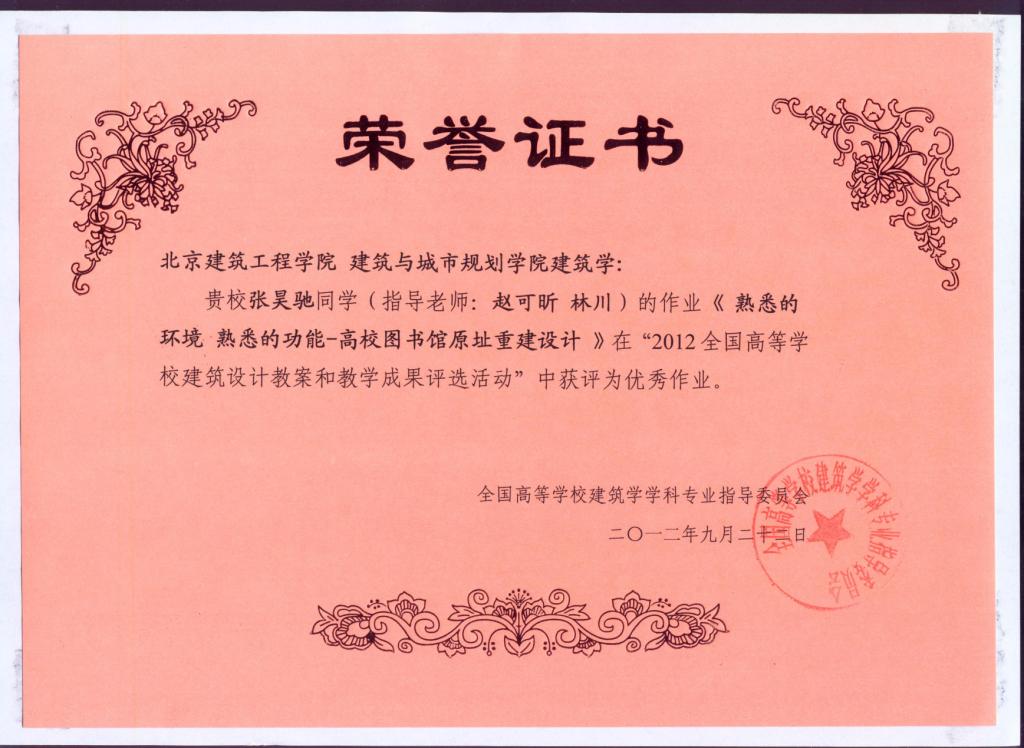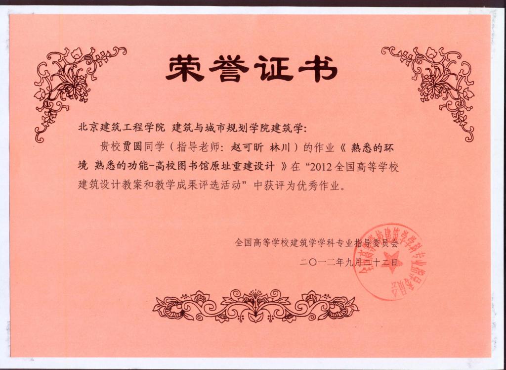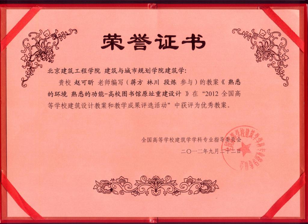 2012全国高等学校建筑设计教案和教学成果优秀教案奖,一份;