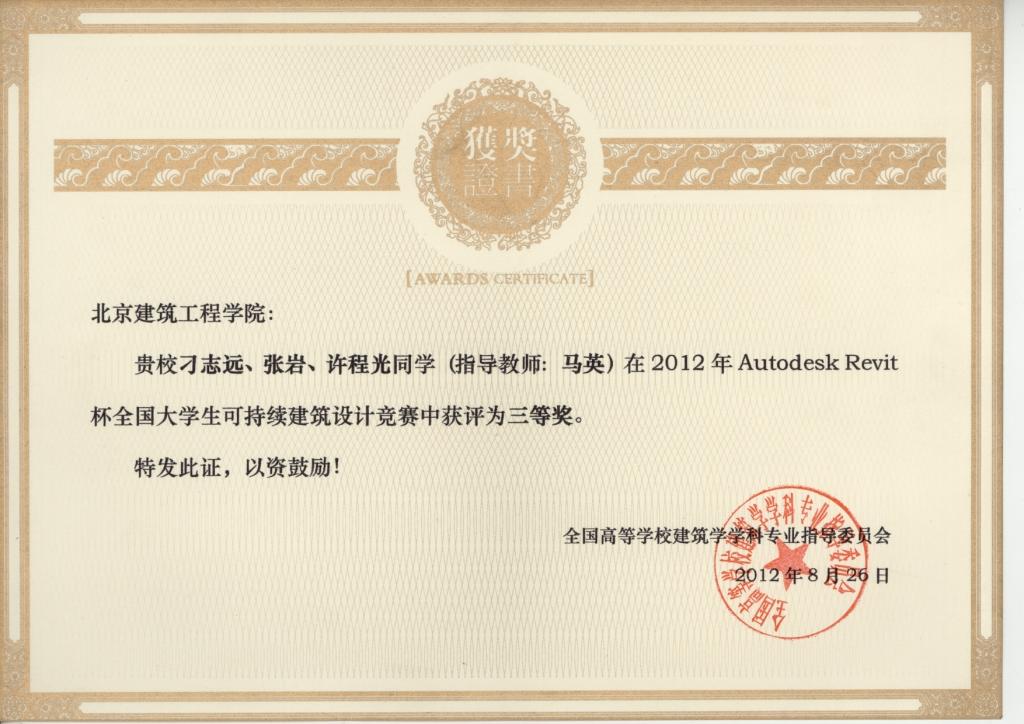 2012年Autodesk Revit杯全国大学生可持续建筑设计竞赛三等奖,一份。
