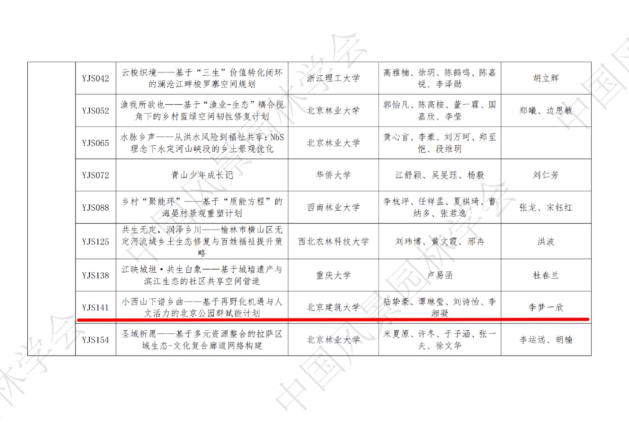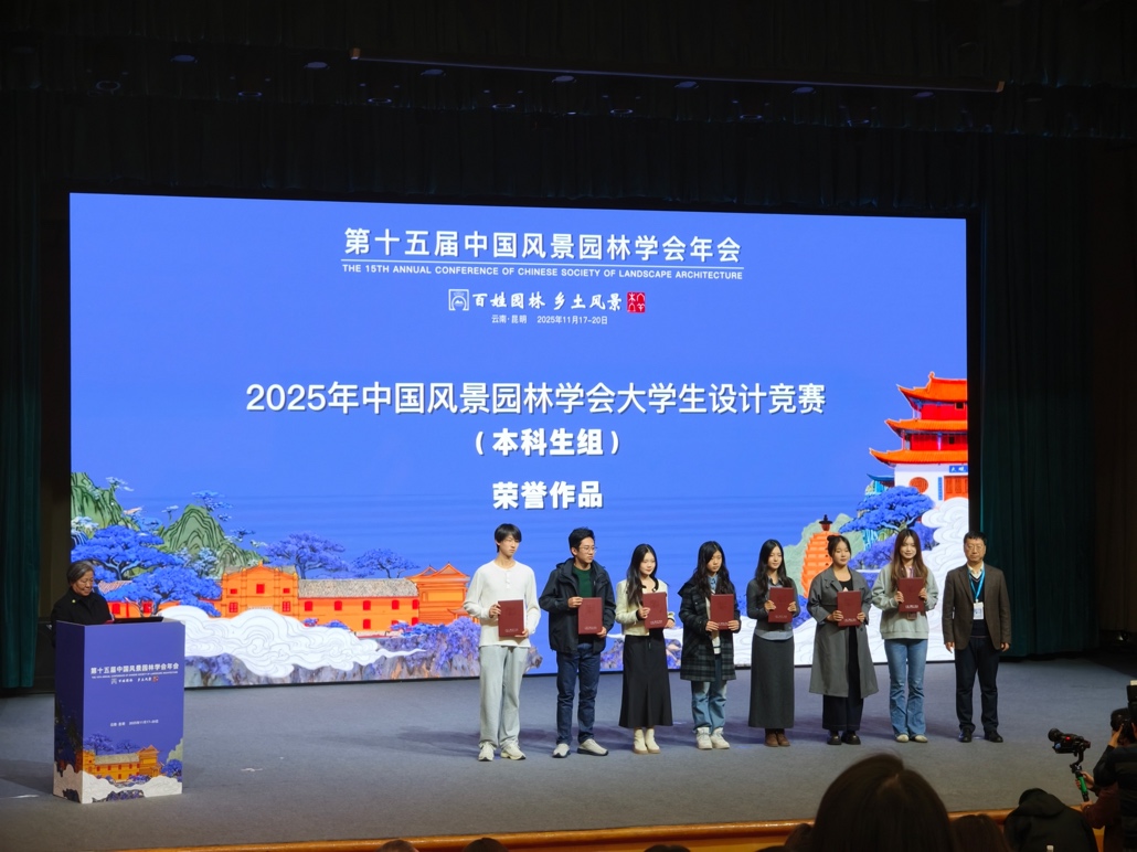 2025年11月18-19日,第十五届中国风景园林学会年会在昆明市成功举办。年会期间公布了2025年中国风景园林学会大学生设计竞赛(2025 CHSLA)优秀作品名单,大赛共设杰出作品、卓越作品和荣誉作品三个重要奖项。评审委员会从413份有效方案中,评选出研究生组杰出作品5份、卓越作品14份、荣誉作品26份;本科生组杰出作品5份、卓越作品10份、荣誉作品30份。努努影视 风景园林系李梦一欣副教授指导研究生团队、李鑫老师和城乡规划系丁奇教授指导本科生团队分别获得“荣誉作品奖”(即三等奖)。