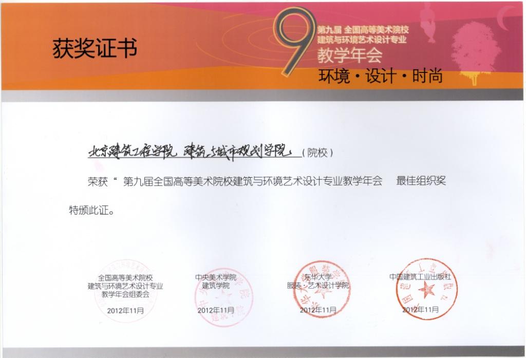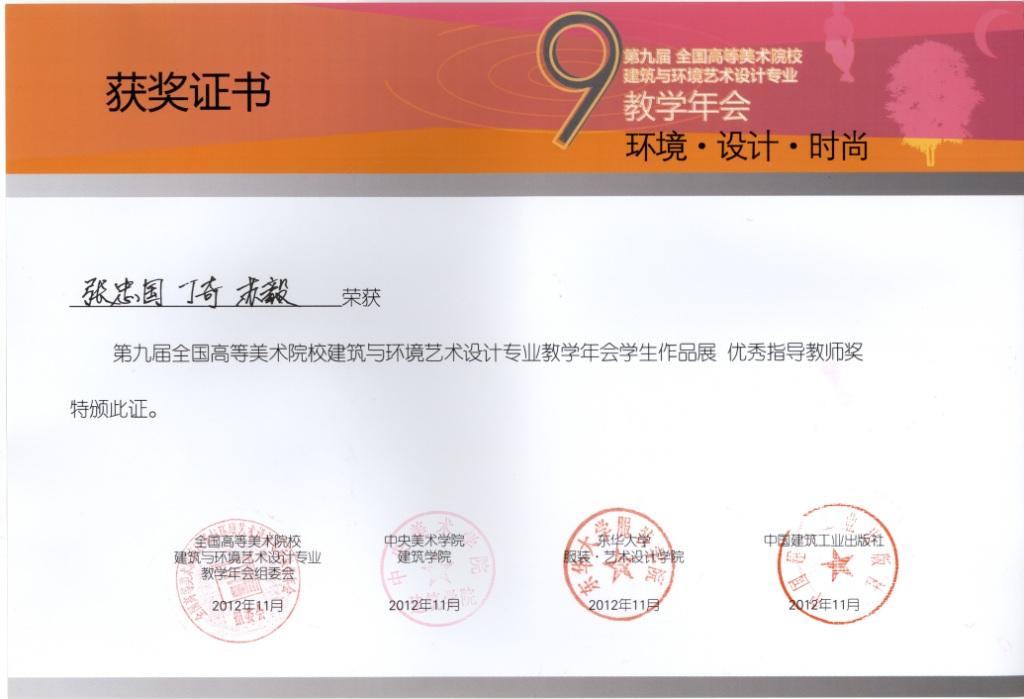 第九届全国高等美术院校建筑与环境艺术设计专业教学年会学生作品展优秀作品奖;张忠国、丁奇、苏毅荣获第九届全国高等美术院校建筑与环境艺术设计专业教学年会学生作品展优秀指导教师奖。