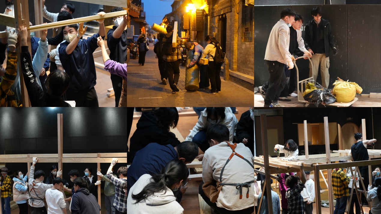 10月28日凌晨五点,天空还泛着星光,同学们就从学校出发,前往北京大栅栏三井胡同,开始准备一天的搭建工作。在非遗传承人木匠谢师傅的带领下,同学们以工作小组的形式,分工协作,最终顺利按时完成搭建工作。搭建完成后的次日,aKoff异样剧团的演出顺利举办。同学们与艺术家合作制作了海报和演出时的道具和家具,并在胡同内布置了视觉导览。演出当天效果出众,之后作为设计周的场馆装置,同学们搭建的成果又持续展览了三周。