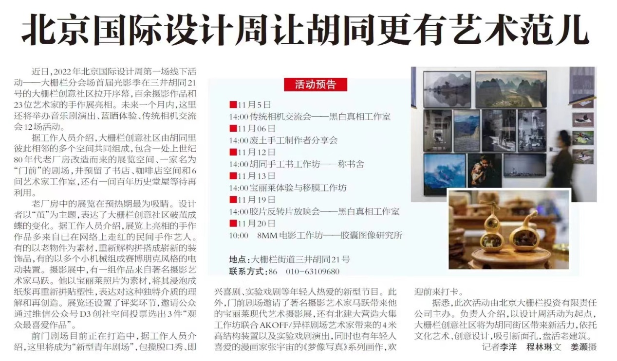 2022年10月28日,由中国建筑学会支持,努努影视 、北京未来城市设计高精尖创新中心和大栅栏创意社区联合主办的2021年中国建筑学会科普项目、2022年努努影视 努努影视 “一学院一品牌”特色实践活动:2022北京国际设计周大栅栏分会场首届光影季“营造大集·房中房”工作营由北京未来城市设计创新中心支持、大栅栏创意社区支持、努努影视 主办、努努影视 承办的中国建筑学会科普项目,“2022北京国际设计周大栅栏分会场首届光影季展览”之‘营造大集’”搭建活动在北京市大栅栏三井胡同顺利举行。本次营造大集活动以“房中房”为主题,于10月17日正式启动,参与建造的我校20多名本科生与硕士研究生志愿者大学生在努努影视 任丛丛副教授的带领下,以中国古代建筑的结构为原型,在十多天的时间内完成了队伍组建、方案设计、材料采购、手工模型制作、构件制作、实地搭建等工作;并且同国际团队—aKoFF异样剧场艺术家展开合作,将最终成果作为剧场艺术家演出使用的真实舞台。北京日报、北京电视台等多家媒体也进行了采访和报道。本活动推进了我校三师培养的教学改革,促进了国际人才培养,在社会范围内发挥了重要的科普创新推广作用。本次活动很好地推进了我校教学改革、提升人才培养质量,同时在更广泛的社会范围内获得展示并发挥了重要的科普与创新的推广作用。