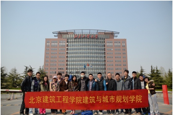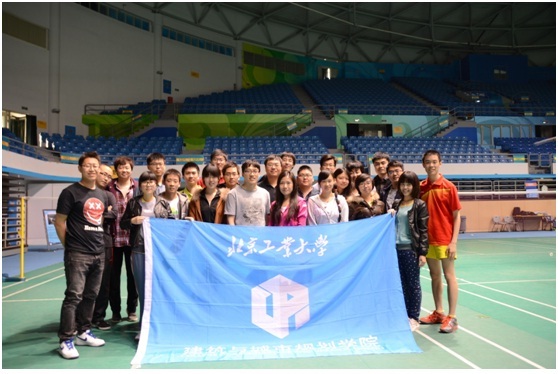 同学由学校集合出发,前往目的地。14点左右,一行人到达北京工业大学南门,受到北工大接待人员的热烈欢迎,并在门前合影留念后,进入校园,来到位于学校东南角的羽毛球馆。