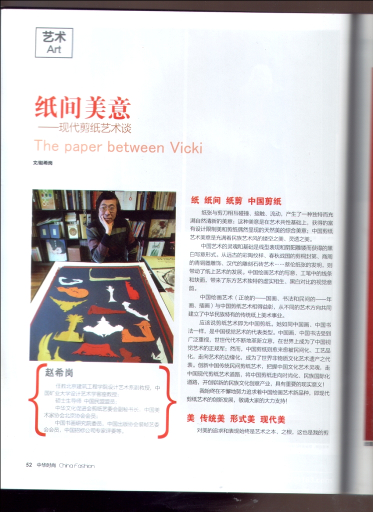 2013年3月《中华英才-中华时尚》杂志以现代艺术论文“纸间美意——现代剪纸艺术谈”为题专题报道了赵希岗的创作理念和方法,其中的“传统美”与“现代美”、“现代剪纸艺术的写意精神”等论述表达了作者对现代艺术的认识。另外,杂志还发表了赵希岗的十几幅现代剪纸艺术作品;