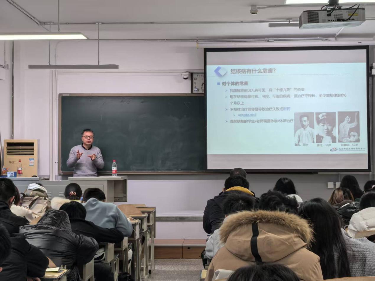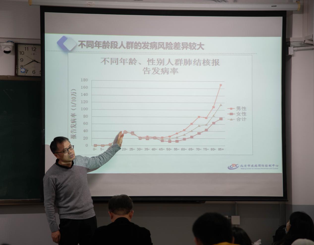 讲座第二部分,北京市疾控中心结核病控制所所长、副主任医师高志东为同学们系统讲解了结核病的防控知识。作为全国结核病防治领域的资深专家,高所长紧密结合高校人群密集、接触频繁的特点,详细阐述了结核病的病原学特征、传播机制与核心防治策略。他深入解读了校园结核病防控的具体措施与应急处置要求,并指出,构建坚实的校园传染病防控网络需要每一位师生的参与,只有将科学的防治知识转化为日常的行为习惯,才能真正筑牢校园健康屏障。