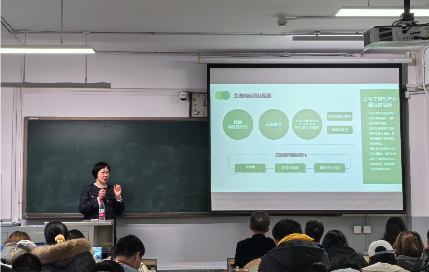 在讲座第一部分,首都医科大学附属北京妇产医院疾控感染处主任费秀珍围绕大学生生殖健康与重点传染病防控主题,进行了深入浅出的讲解。费主任长期从事女性健康教育与感染防控研究,她通过详实的数据与案例,重点介绍了HPV感染与艾滋病的传播途径、科学预防措施及疫苗接种的重要性。她特别强调,HPV防护是关乎男女共同健康的议题,鼓励同学们以科学、积极的态度认识并主动预防,提升自我保护能力,减少校园内的疾病传播风险。同时,费主任也从生殖健康常识切入,系统讲述了艾滋病的传播机制与有效阻断措施,并介绍了国家提供的相关检测与咨询服务,引导同学们消除误解与偏见,树立负责任的行为观念。