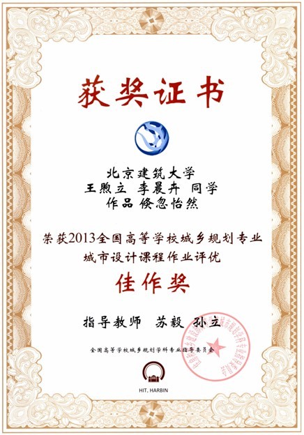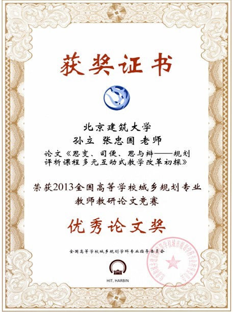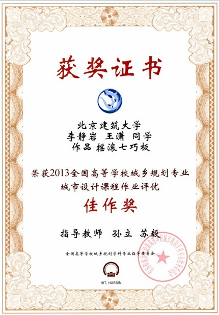 在专指委全体会上,还对今年的获奖作品进行了表彰。我校孙立、张忠国的教研论文《思变、司便、思与辨—规划评析课程多元互动式教学改革初探》获得优秀论文奖,并应邀在大会上作了宣讲;学生范金龙、赵洪民、李嘉宇、付乐的《“单停单行”方案分类深化》获得城市交通出行创新实践竞赛三等奖,指导教师是范霄鹏;学生李静岩、王潇的《摇滚七巧板》获得城市设计竞赛佳作奖,指导教师是孙立、苏毅;学生王煦立、李晨卉的《倏忽怡然》获得城市设计竞赛佳作奖,指导教师是苏毅、孙立。
