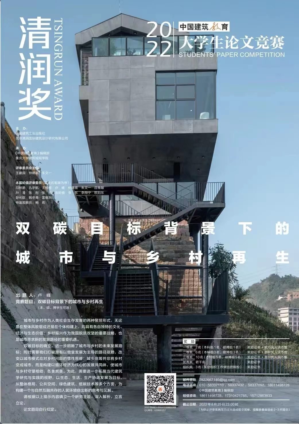 《中国建筑教育》•“清润奖”大学生论文竞赛面向国内外建筑学、城乡规划学、风景园林学以及其他相关专业的本科、硕士和博士生,是在教育部高等学校建筑学专业教学指导分委员会指导下,由中国建筑出版传媒有限公司(中国建筑工业出版社)发起,联合北京清润国际建筑设计研究有限公司共同主办,由《中国建筑教育》编辑部承办的国内最高水平建筑类大学生论文竞赛,素来以级别高、难度大、前瞻性强而著称,已经成为国内外知名建筑院校进行教育教学交流的重要平台,多年来一直受到广泛关注。