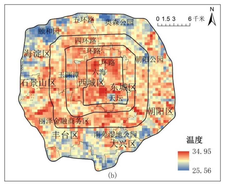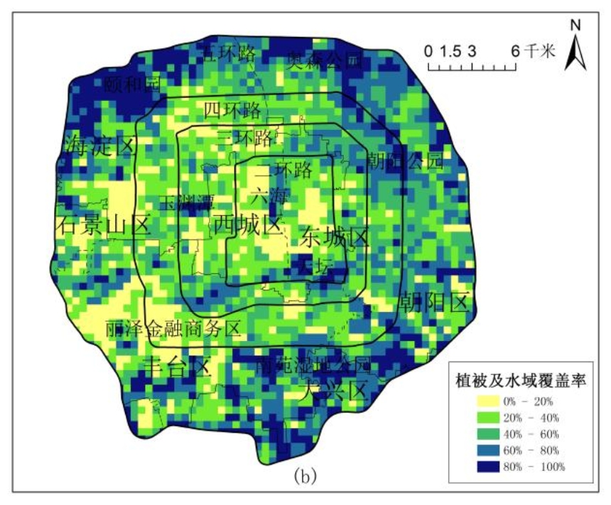图5 研究区地表500m网格温度格局(a)、500m网格植被与水域覆盖率(b)
