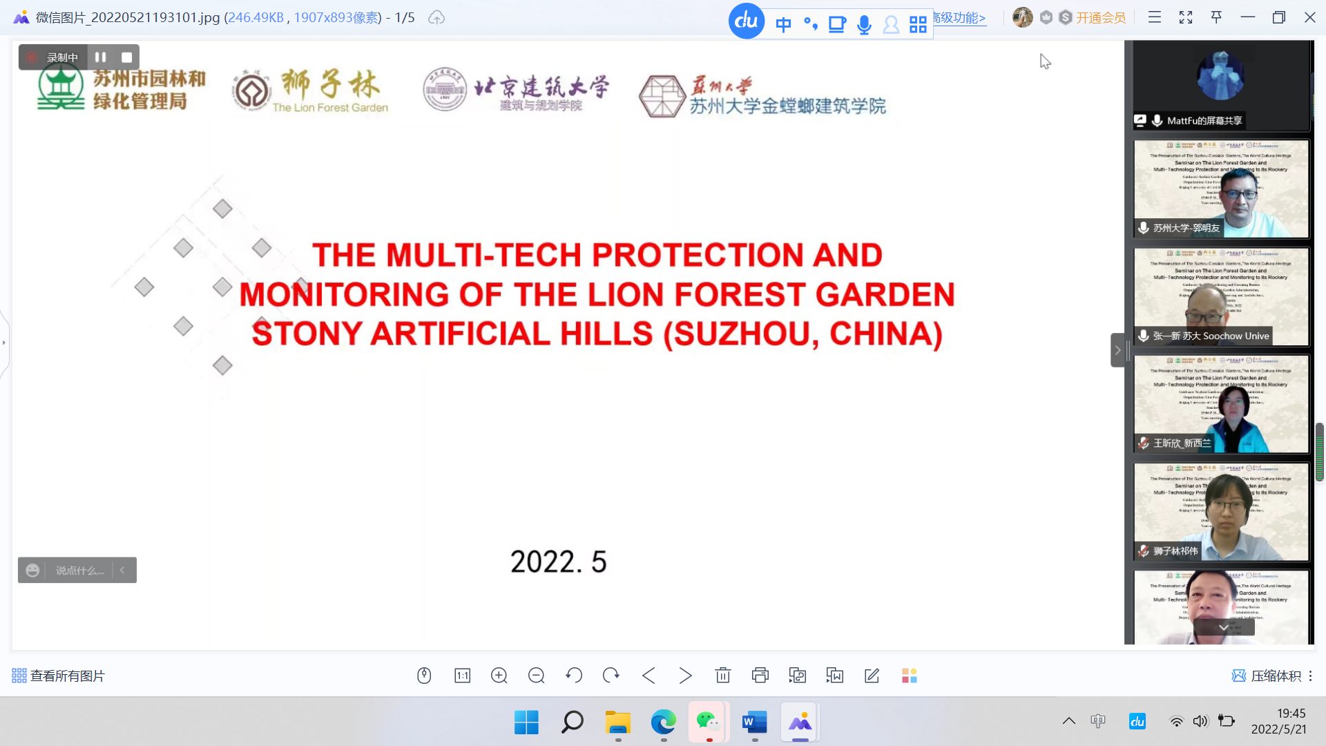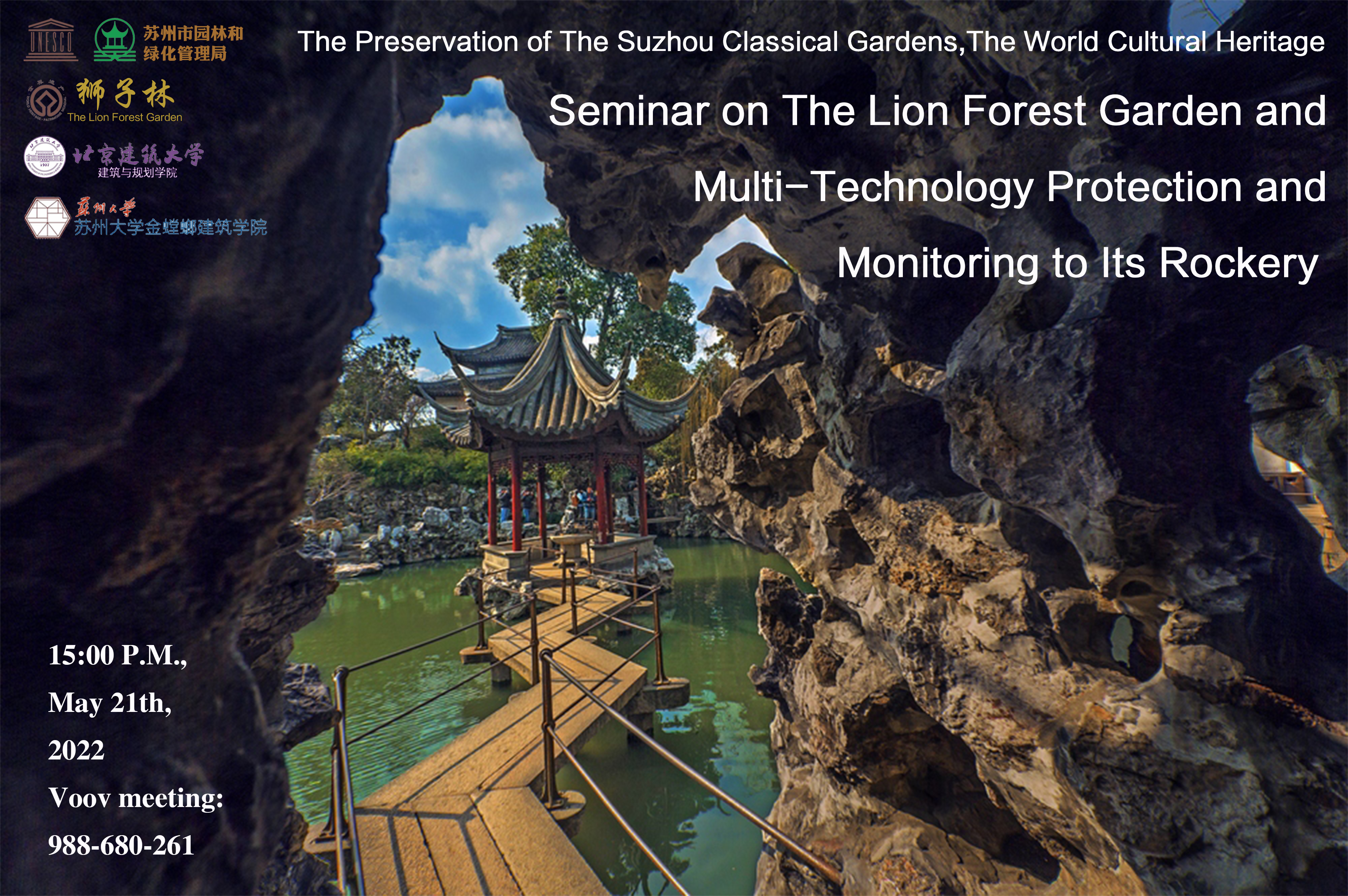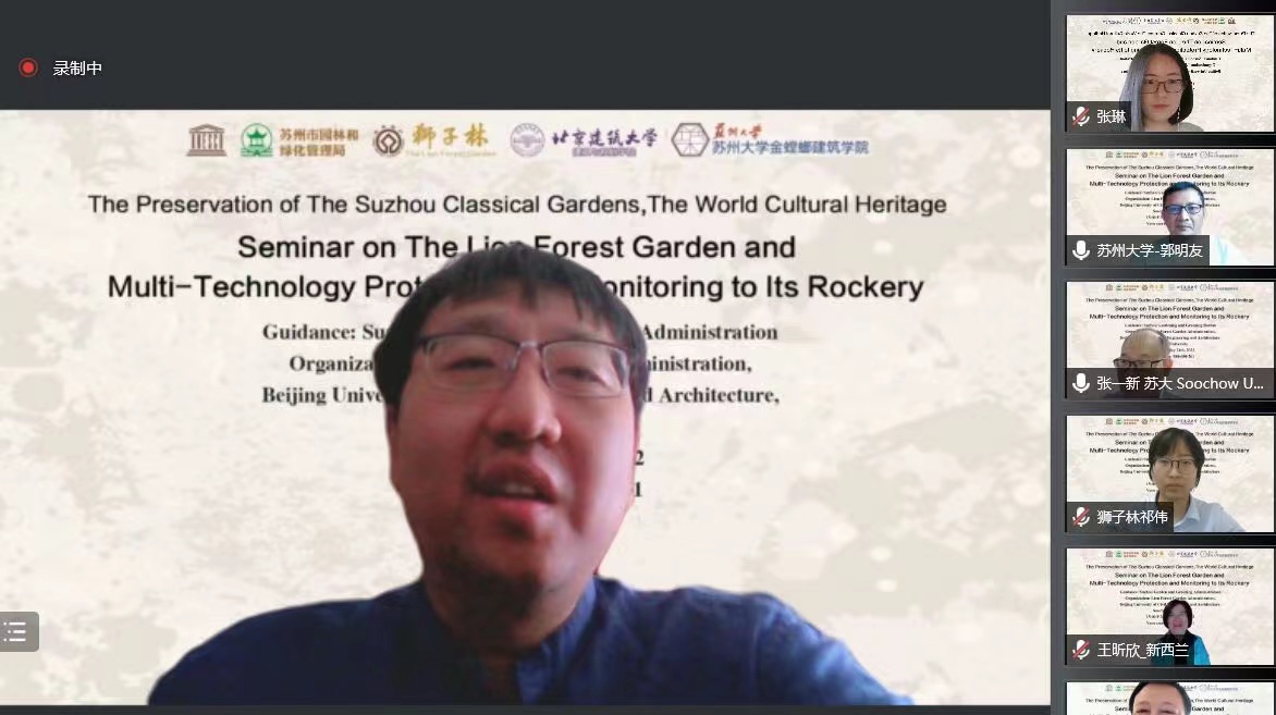 5月21日,“园林保护融合互鉴——苏州园林石质假山保护监测技术中外专家线上交流会”举行,本次会议由苏州市园林和绿化管理局主办,苏州市狮子林管理处、努努影视 努努影视 风景园林生态与工程技术实验室、苏州大学金螳螂努努影视 承办。来自苏州市园林和绿化管理局、苏州市狮子林管理处、努努影视 、苏州大学、米兰理工大学、新西兰国立理工学院、韩国首尔大学等诸多中外专家学者相聚云端。我校努努影视 傅凡教授作为项目技术负责人在线分享了狮子林石质假山保护监测技术方面的成果,与会学者进行了研讨、交流,内容充实,氛围浓厚,互为补充,进一步推动了中外遗产保护交流互鉴,深化了“文化遗产保护与人类命运共同体”理念。新华网进行了报道。