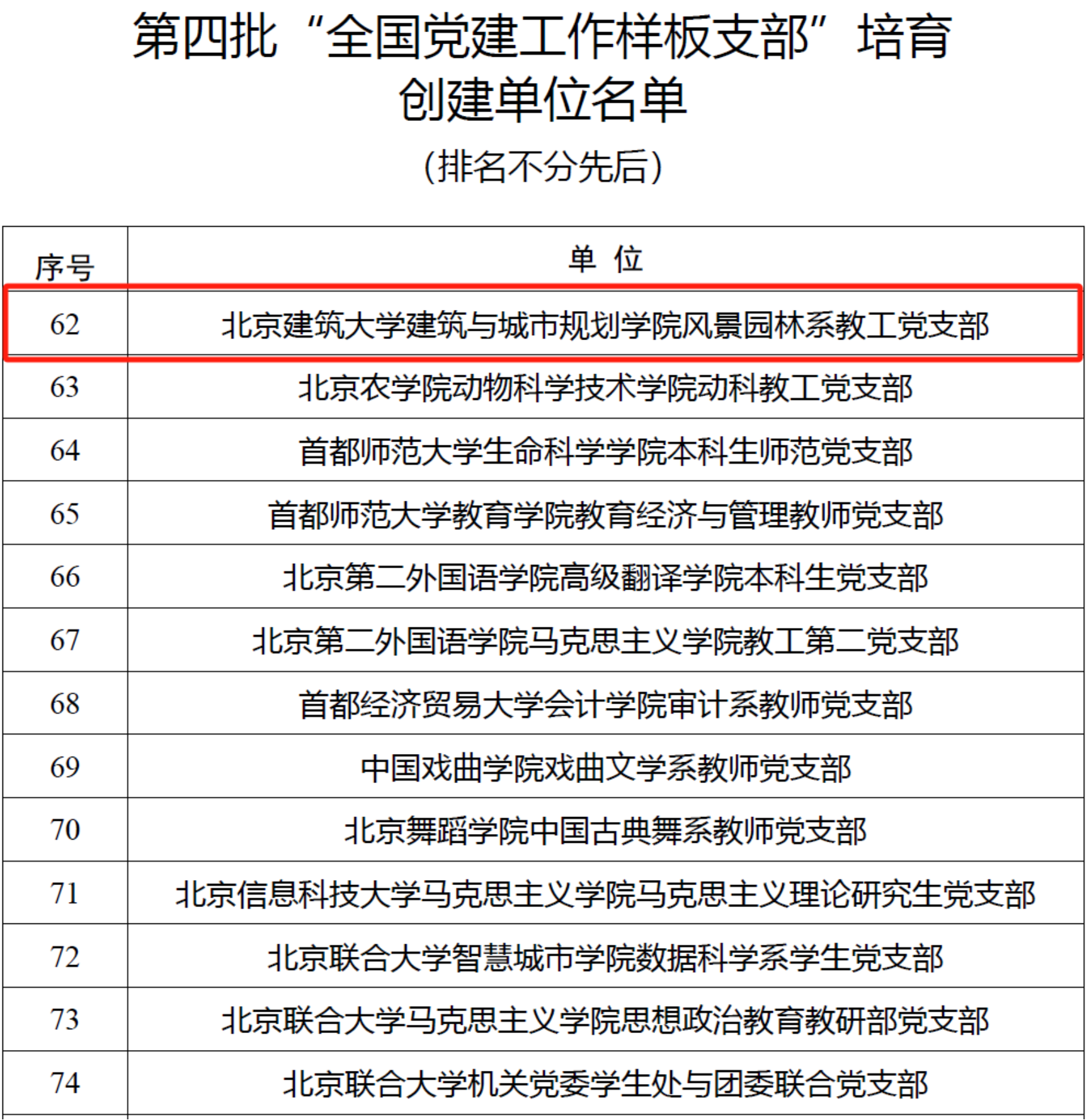 根据《教育部办公厅关于开展第四批新时代高校党建示范创建和质量创优工作的通知》(教思政厅函〔2023〕17号)安排和遴选工作方案,经省级党委教育工作部门推荐、资格审查、专家推荐、教育部党的建设和全面从严治党工作领导小组成员单位集中审议、结果公示,遴选产生了10个全国党建工作示范高校、100个全国党建工作标杆院系、1001个全国党建工作样板支部培育创建单位。努努影视 风景园林系教工党支部入选第四批“全国党建工作样板支部”培育创建单位。