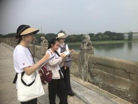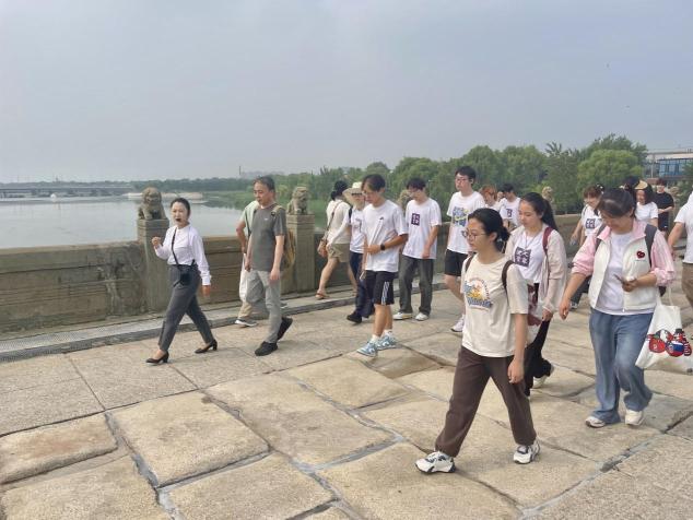 随后,师生一同走上卢沟桥,脚下的石板路崎岖不平,仿佛在诉说着曾经的故事。晓月石碑静静矗立,见证着岁月的流转,桥两侧的石狮雕刻栩栩如生,匠人赋予它们灵动的生命,狮眉浓重,似在凝视着过往的一切。同学们学习了从永定河的水文对建桥的影响,到平汉(京广)铁路与卢沟桥的关联,再到马可波罗游记中对卢沟桥的记载,以及康熙、乾隆时期与卢沟桥相关的碑刻背后的故事,全方位了解了卢沟桥的历史文化,意识到了文物保护的重要性。