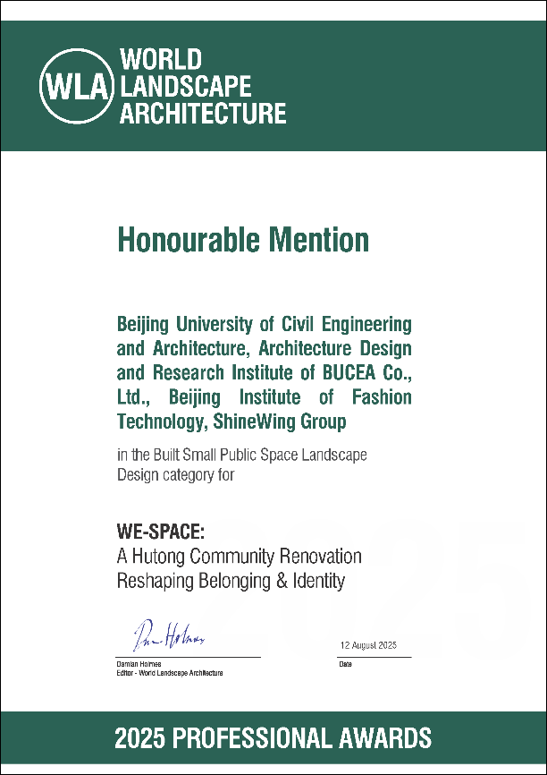 近日,2025 世界景观建筑奖(WLA Awards)公布最终结果,我校天桥街道责任规划师团队牵头的设计项目“WE-SPACE:充满归属感与认同性的胡同社区更新(WE-SPACE: A Hutong Community Renovation Reshaping Belonging & Identity)”,荣获“建成类-小尺度公共空间景观设计(Built-Small Public Space Landscape Design)荣誉提名奖(Honourable Mention)”。