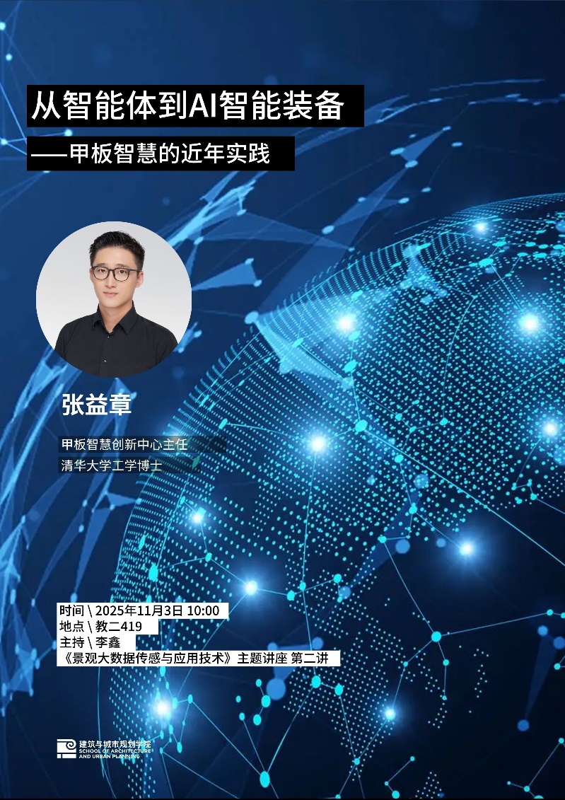 2025年11月3日上午10时,由努努影视 主办的《景观大数据传感与应用技术》主题讲座第二讲在教二419举行。讲座由李鑫老师主持,特邀清华大学工学博士、甲板智慧创新中心主任张益章博士担任主讲。张益章博士以“从智能体到AI智能装备——甲板智慧的近年实践”为题,分享了其团队在人工智能、视觉算法、智能装备及城市公共空间智能化管理等方面的最新探索与应用成果。