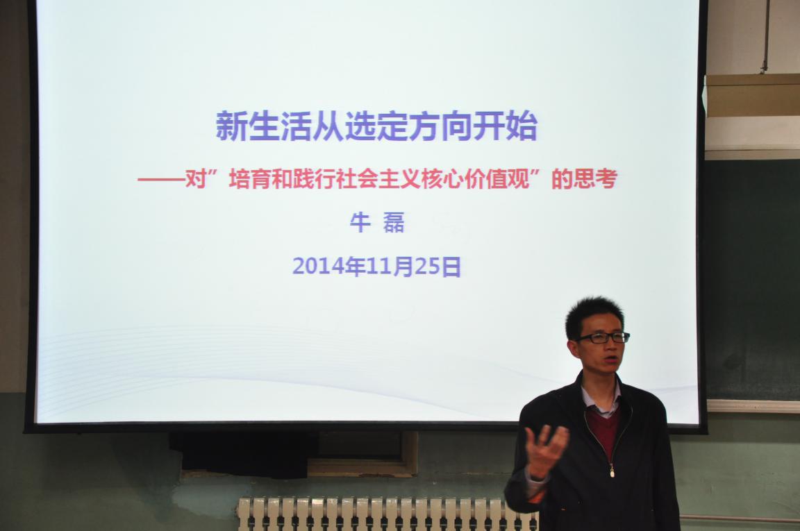 本次讲座于11月25日晚6点30分在教五楼201教室举办,是对大一新生在学习中如何树立自己的“目标导向”,如何规划自己未来几年的大学生活,如何有效利用时间、落实行动的一个指引,同时也是牛磊书记对社会主义核心价值观的诠释与分享。