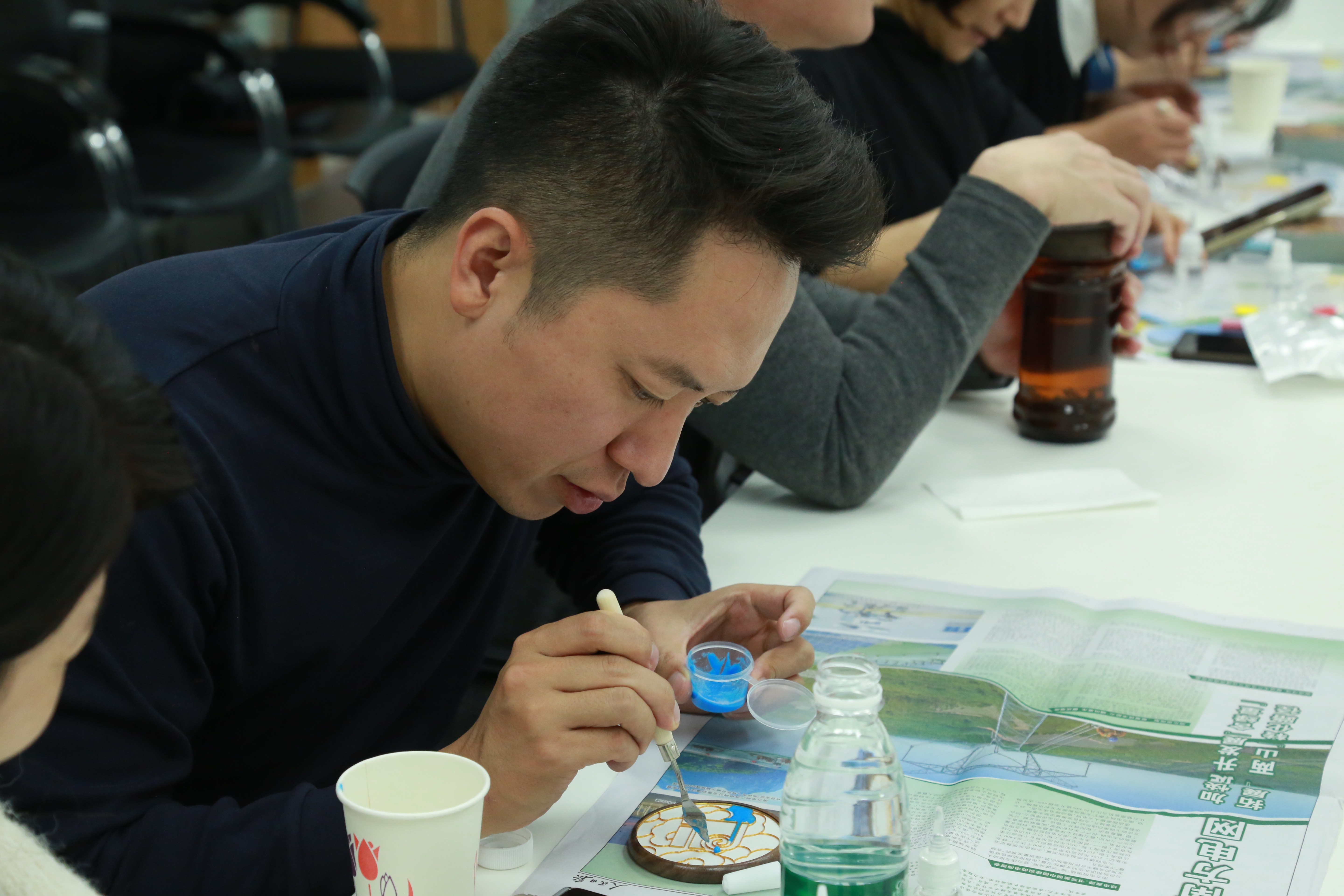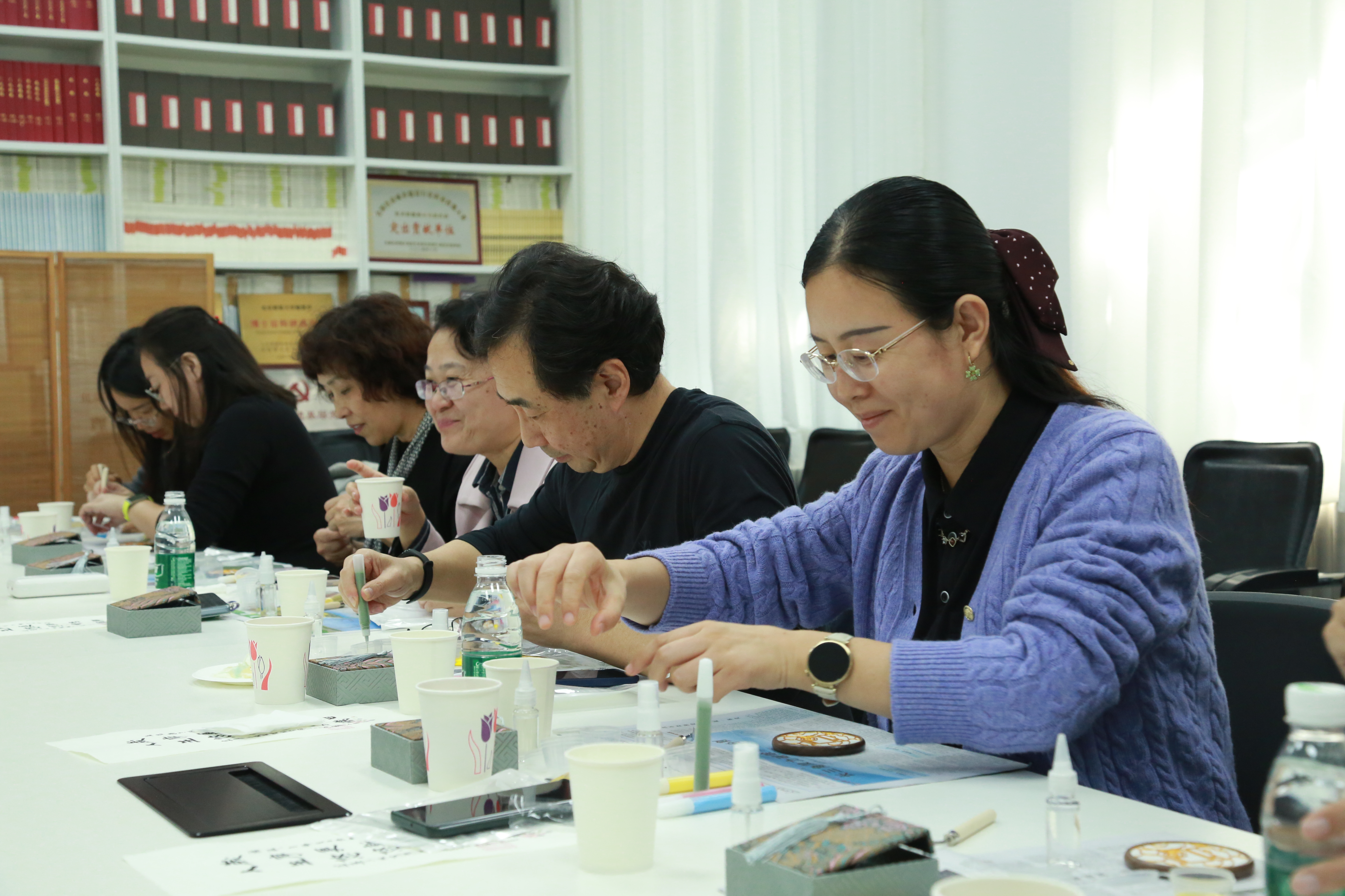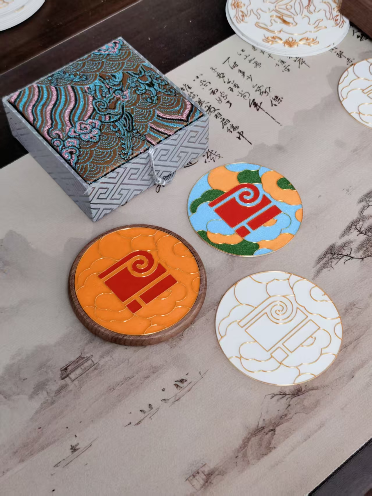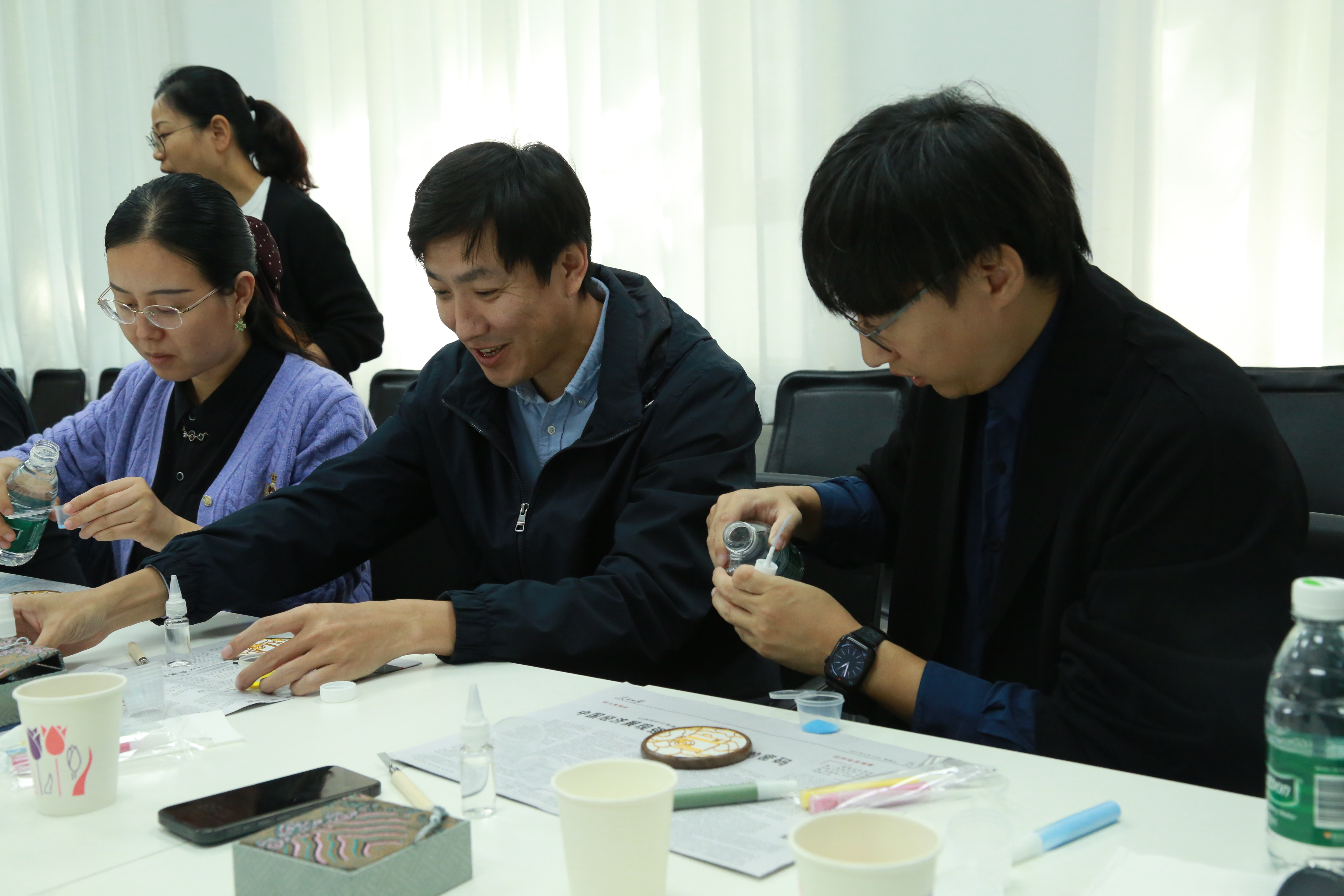 教师们亲手体验掐丝珐琅杯垫制作。在3D打印的金丝勾勒院徽与云纹的轮廓下,用釉料填充云纹图案,经过点蓝、晾干等工序,最终完成兼具实用性与艺术性的作品。何立新书记在体验中表示:这种将建筑美学融入非遗实践的形式,正是文化自信的生动体现。同时,教师们围绕非遗技艺的当代转化展开讨论,提出将珐琅工艺应用于建筑模型装饰、文创产品开发等创新设想,为后续产学研合作埋下伏笔。
