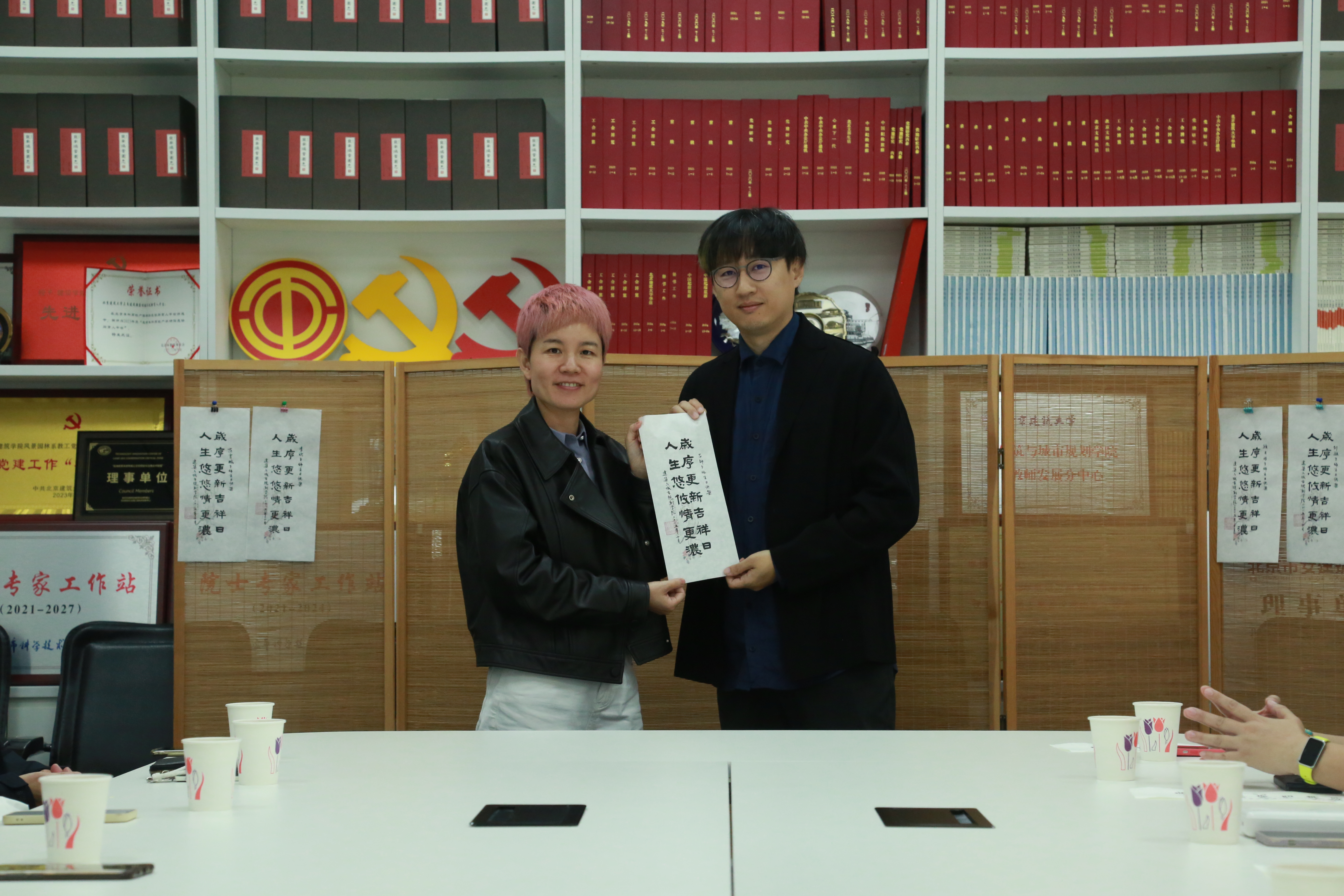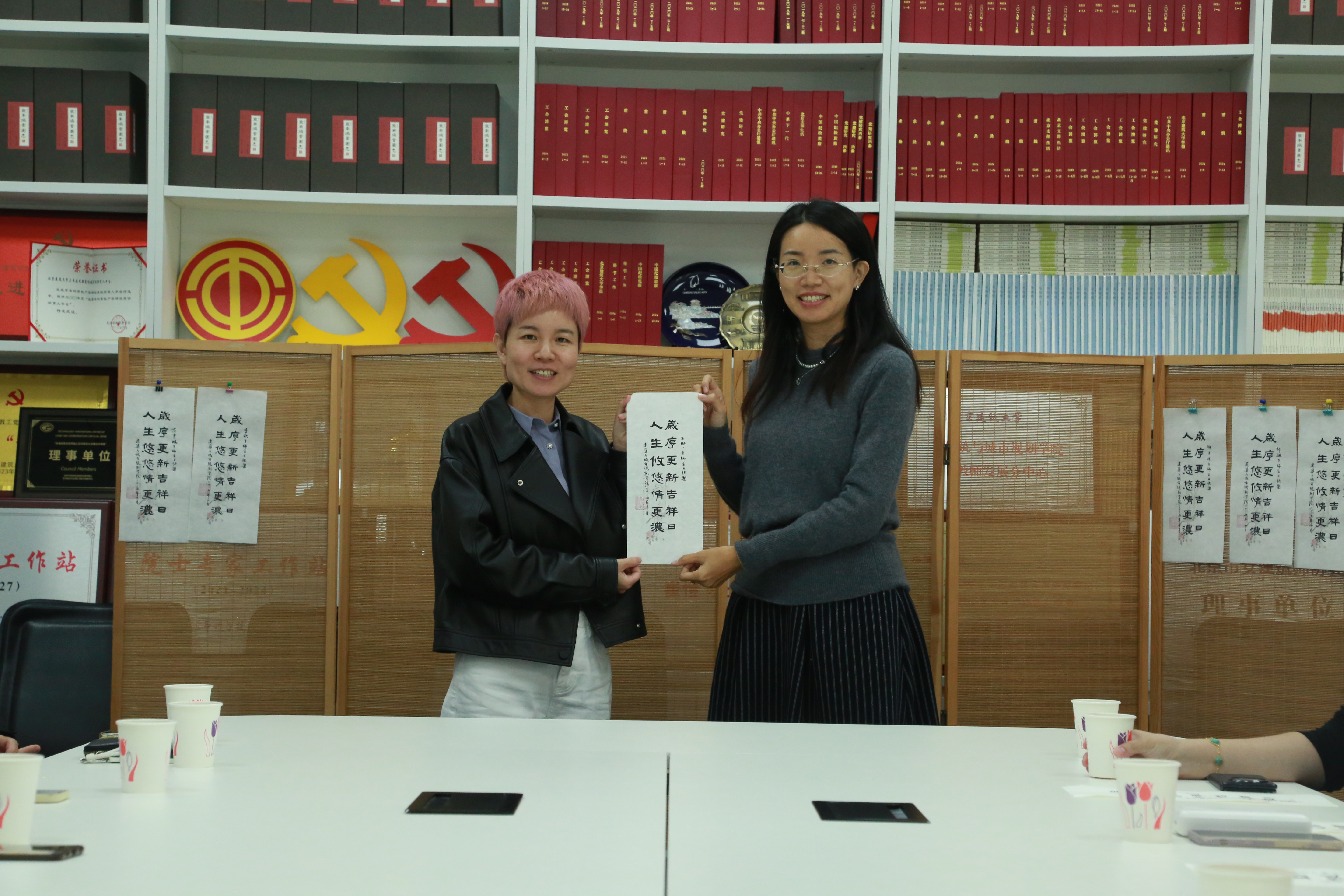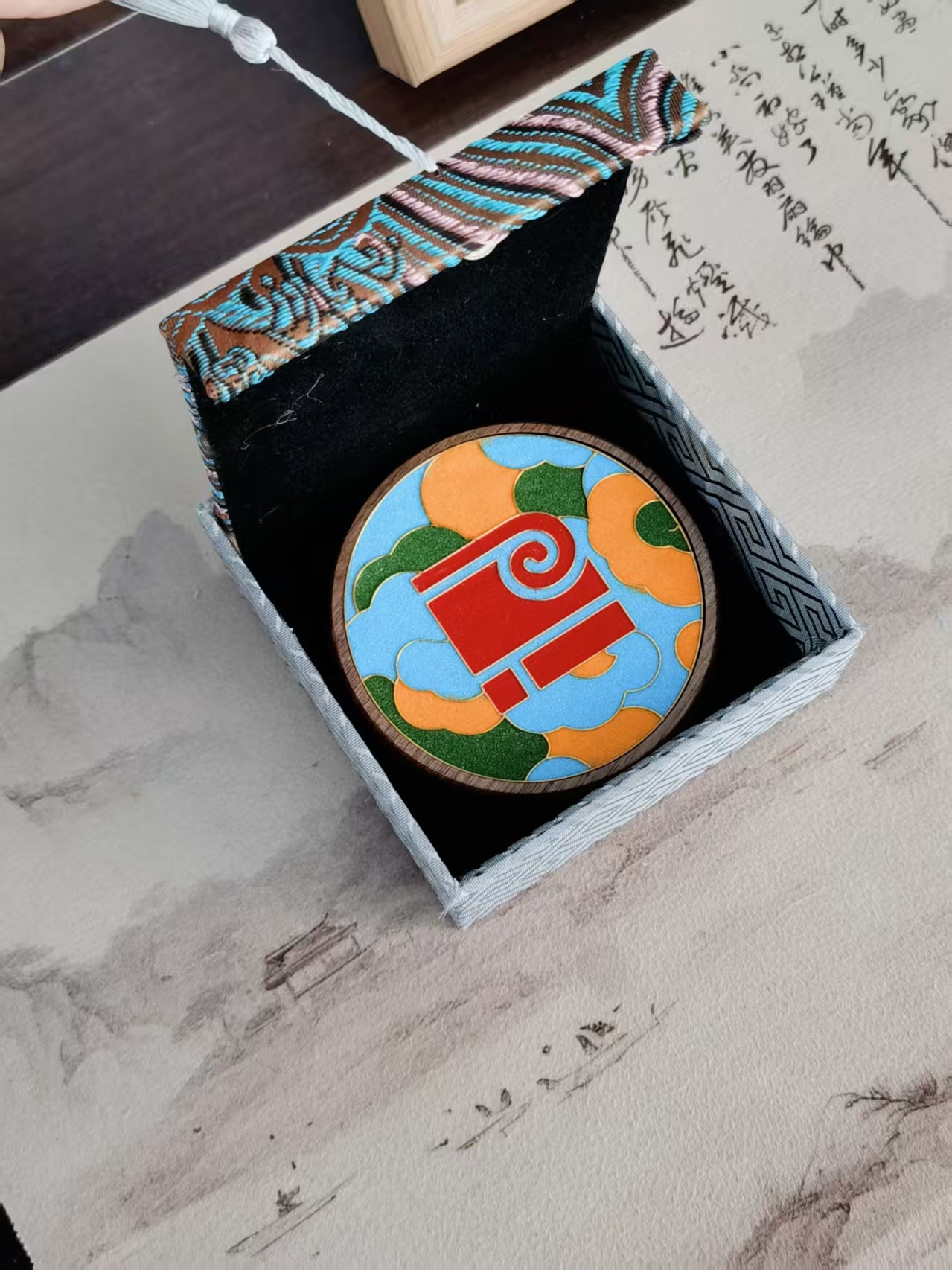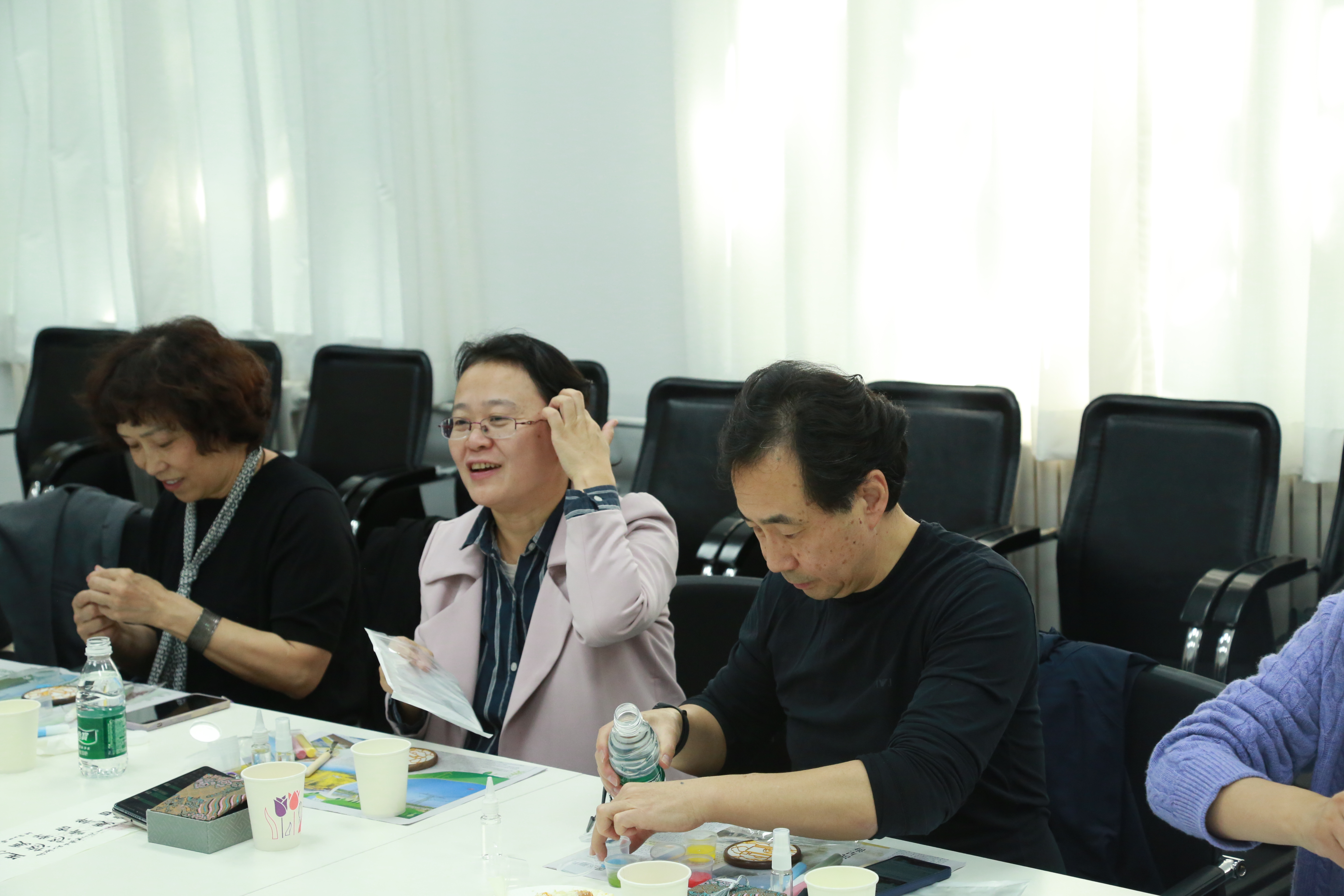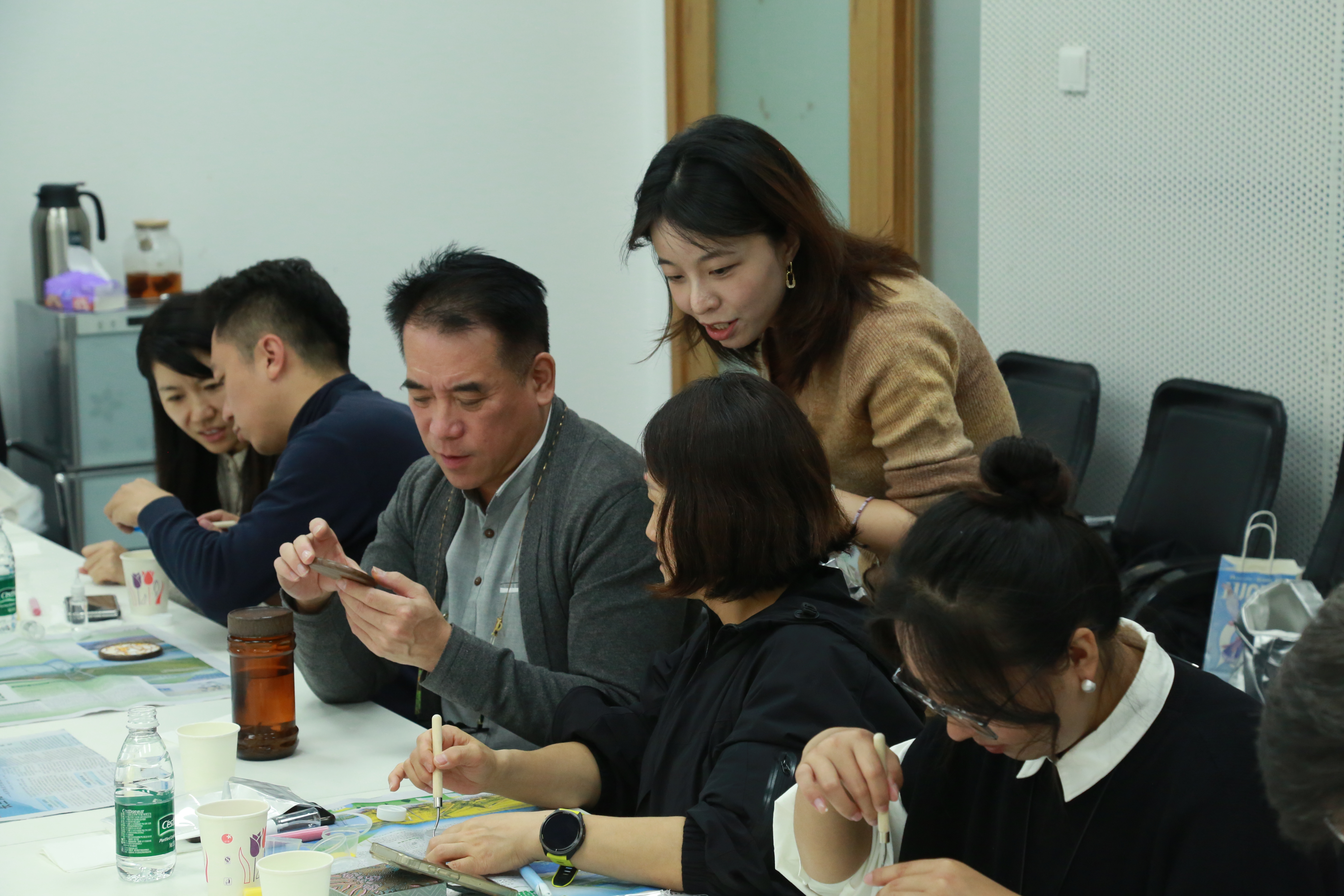 教师们亲手体验掐丝珐琅杯垫制作。在3D打印的金丝勾勒院徽与云纹的轮廓下,用釉料填充云纹图案,经过点蓝、晾干等工序,最终完成兼具实用性与艺术性的作品。何立新书记在体验中表示:这种将建筑美学融入非遗实践的形式,正是文化自信的生动体现。同时,教师们围绕非遗技艺的当代转化展开讨论,提出将珐琅工艺应用于建筑模型装饰、文创产品开发等创新设想,为后续产学研合作埋下伏笔。
