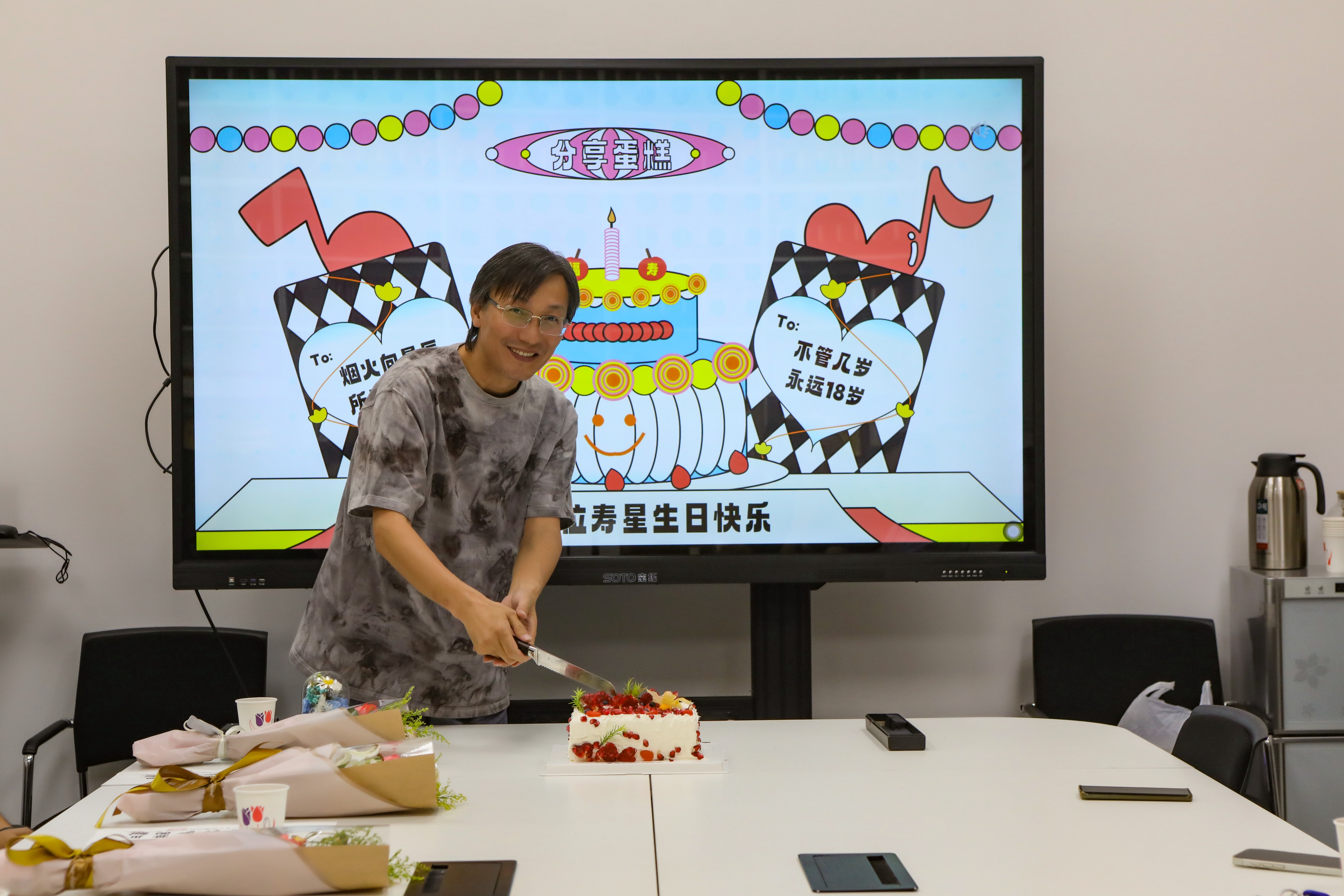 当优美的旋律响起,“美的分享”环节将氛围推向高潮。长桌中央推出定制的石榴蛋糕,寓意着收获与团结。寿星代表孙恩杨老师切开生日蛋糕,老师们围坐在一起,品尝着美味的蛋糕,分享着工作的心得、生活的趣事和对学院的感谢。