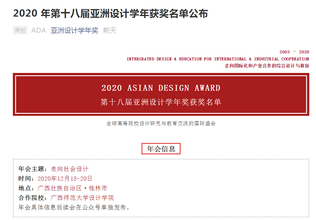 师生在“2020 年第十八届亚洲设计学年奖”评选中获得“一金、一银、二铜、二优秀、一优秀组织、一优秀指导”共八项奖项。亚洲设计学年奖(2003年-2020年)致力于打造亚洲国家和地区高校间更大范围、更大规模、更深入交流、更具影响力的专业权威性设计交流盛会。从2003年至今,经过17年的积累,在建筑、景观、室内、展示、光环境、城市设计的框架和基础上,将国际、国内的设计界、设计高校、协会组织等充分对接,成为推进学术界与产业界交流和发展的平台。