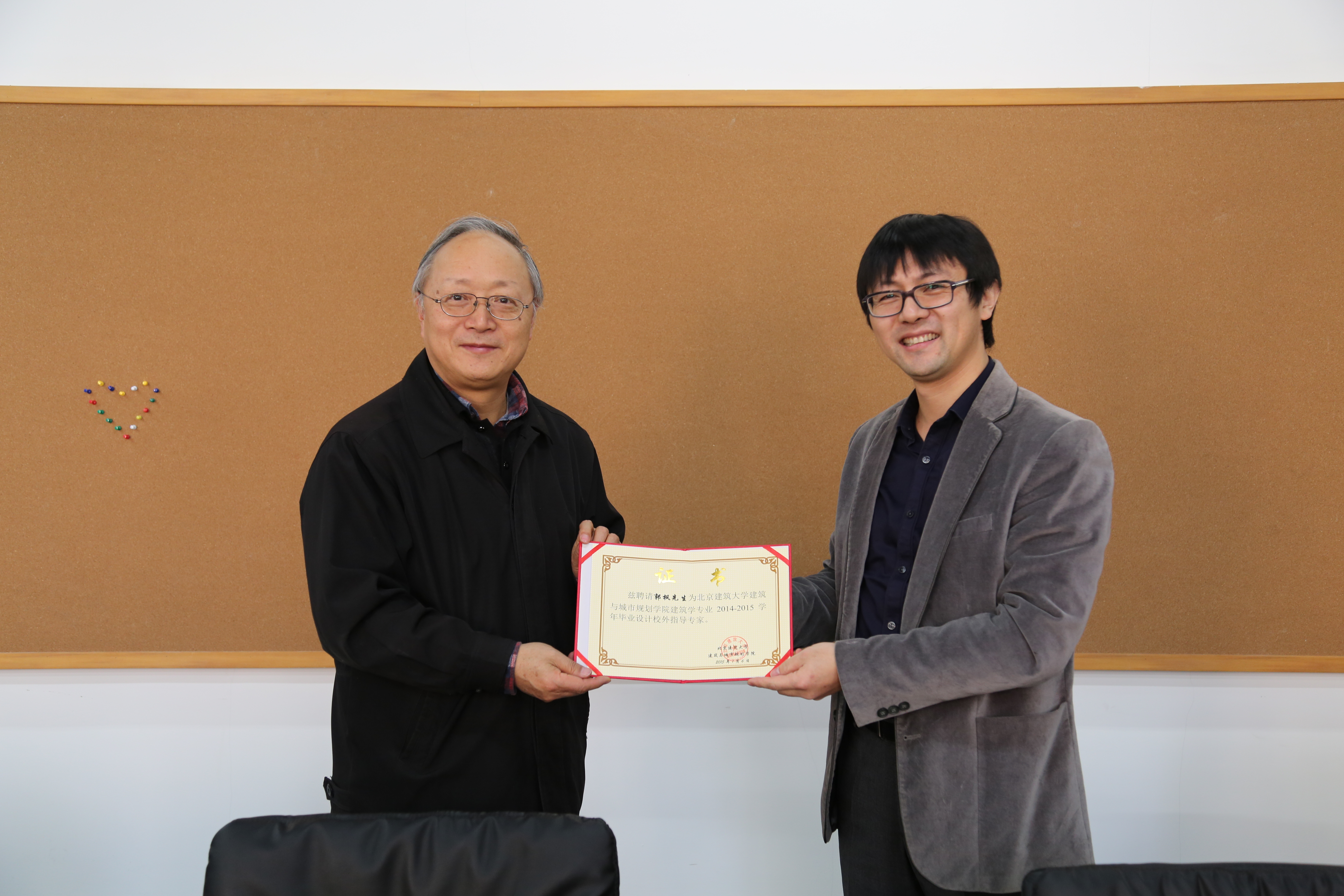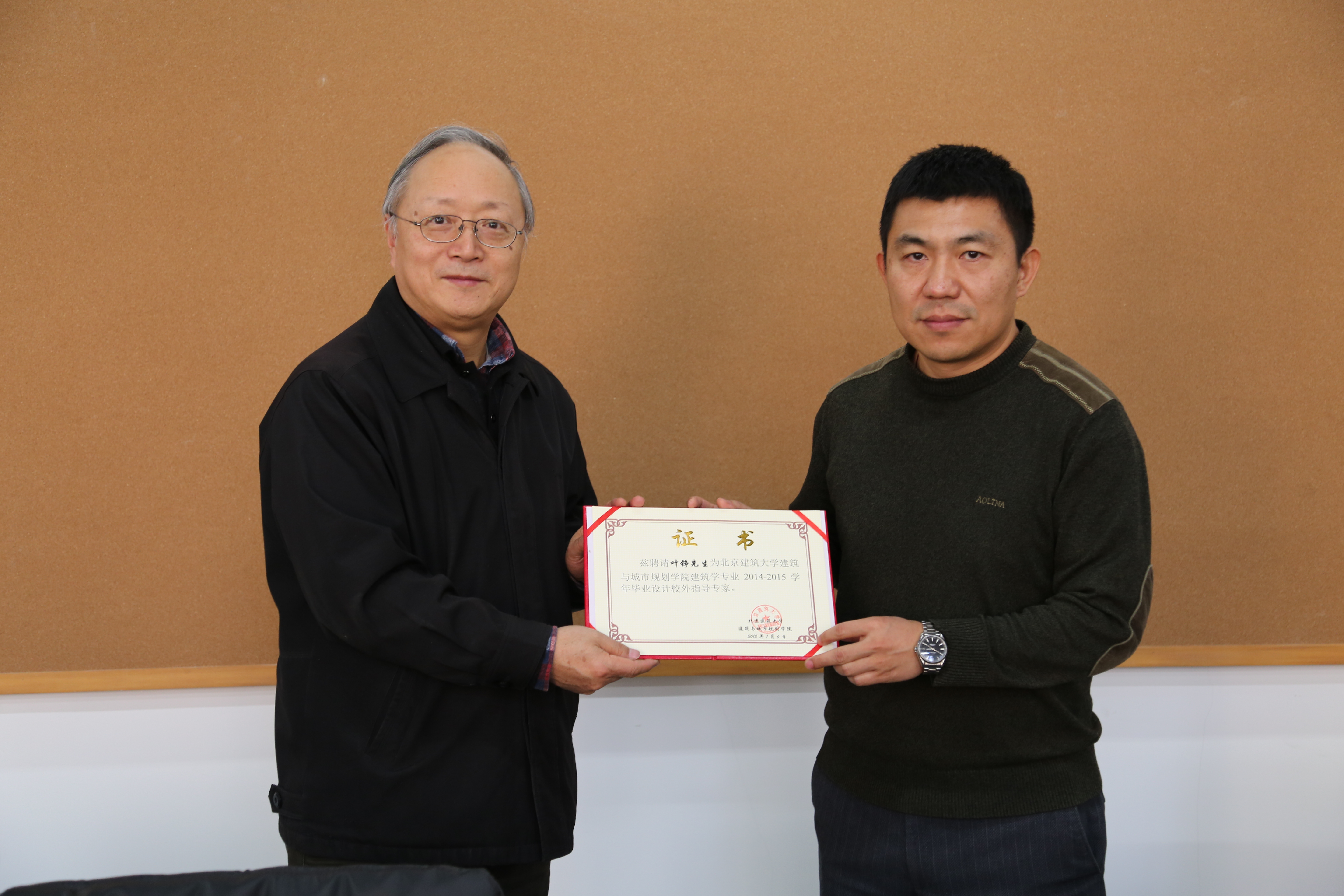 教师的专业水平。作为此次受邀的校外导师,中国建筑设计研究院有限公司建筑院副院长叶铮认为,学校与企业联合的概念对于双方都责任重大,并感谢我校给一线建筑师参与教学与学术活动的机会,作为一名职业建筑师也有责任把实际工程经验带给学生;郭枫总经理对往年我校聘请企业建筑师为校外导师的做法表示赞扬,并特别指出北京泽碧克格鲁建筑设计咨询有限公司对此十分重视,在人力和物力上都投入了许多。建筑师孙昊提出,这样的指导过程是教学相长的过程,他非常期待这样与学生直接交流的机会。其他校内指导教师也进行了与校外导师的面对面沟通与交流。牛磊书记为此次聘任仪式做结语,认为这样的指导过程是教学与实践相结合的过程,不仅对学生今后的工作学习有极大的帮助,而且对各建筑企业而言,也是培养人才、发现人才的好机会。牛书记希望此次联合指导能延续往届的优良成果,并能再创佳绩。