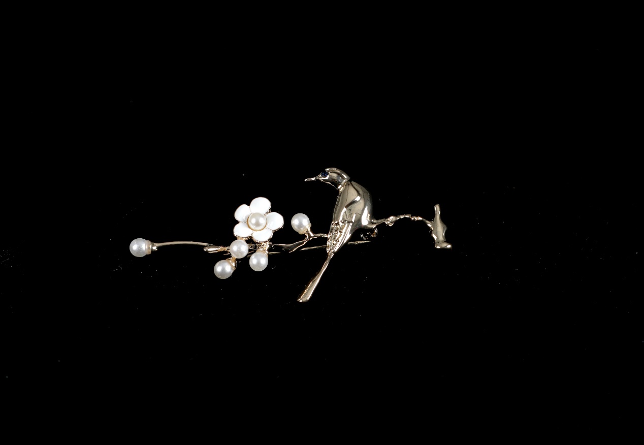 故宫文创“宫梅顾盼”胸针的设计元素源于故宫博物院馆藏文物“梅花绣眼图页”,宫梅的画法精细纤巧,敷色厚重,自有一种富贵气息。胸针取画中绣眼形象进行立体效果设计。胸针中鸟儿俏立枝头,鸣叫顾盼;梅花横斜疏影,瘦劲清丽,两者相映成趣,构成一幅美丽典雅的花鸟图。