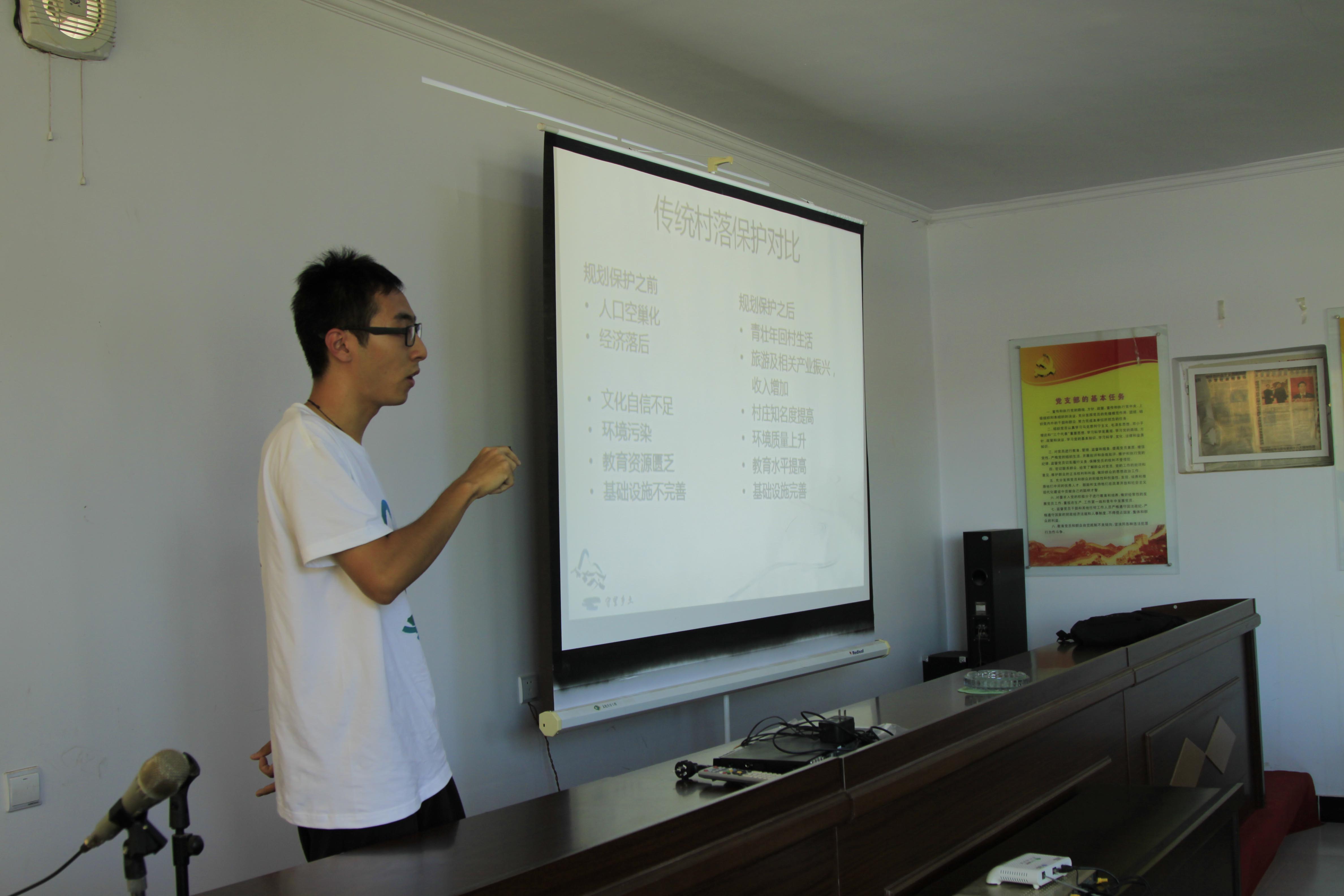 志愿者宣讲结束后,丁奇老师对志愿者同学的宣讲进行了总结,并运用丰富的村落规划案例,结合前期对北庄堡村的详细调研,深入浅出的为民村讲解了村落保护和合理开发能够给村民带来哪些改变和实惠,博得了台下村民的阵阵掌声。