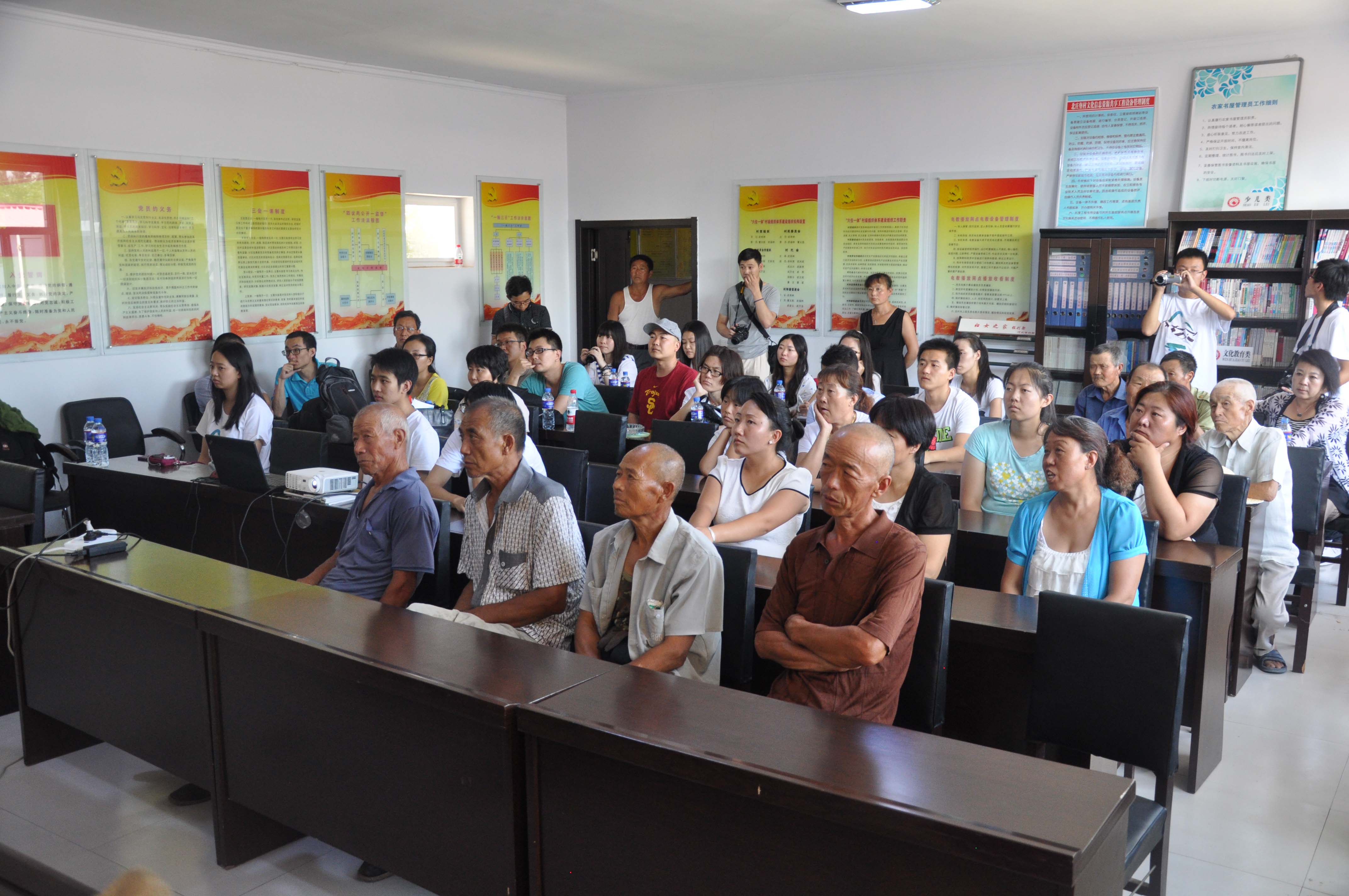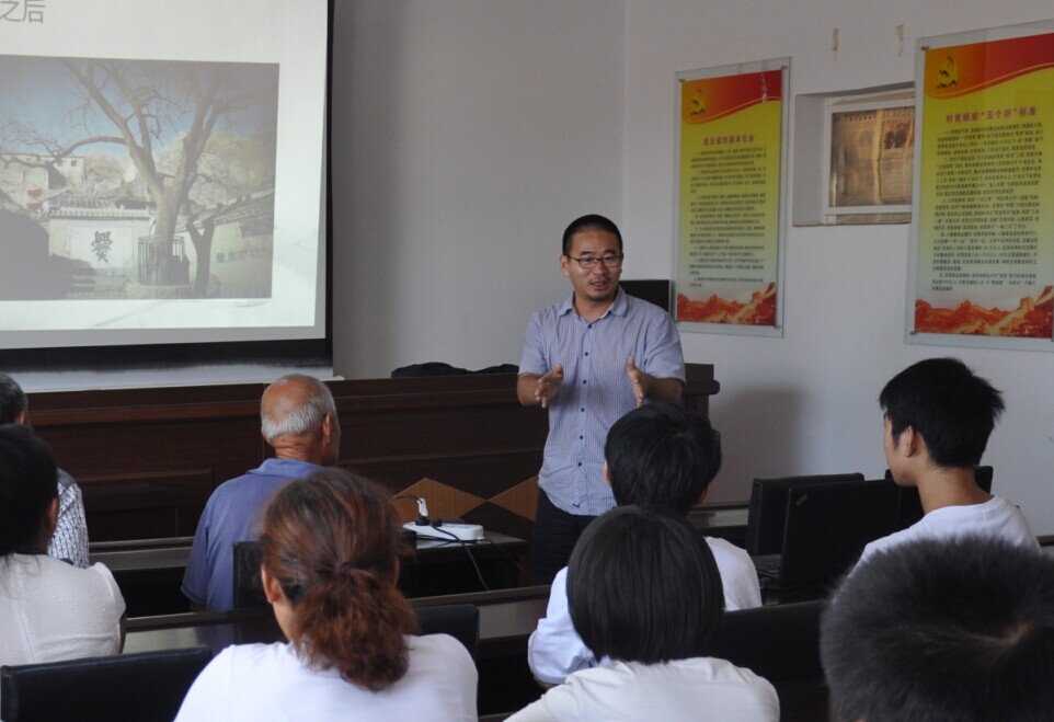 8月2日上午志愿者服务团全体成员来到北庄堡村村民活动室为村民开设“乡土学堂”,结合当地村落的实际情况,向村子里的留守村民讲授传统村落的历史渊源和文化内涵,怀安县委副书记刘斌、怀安县长助理徐强特意赶来参加,40多位村民冒着烈日赶到现场参加了本次活动,本次宣讲由志愿者代表赵博新主讲,努努影视