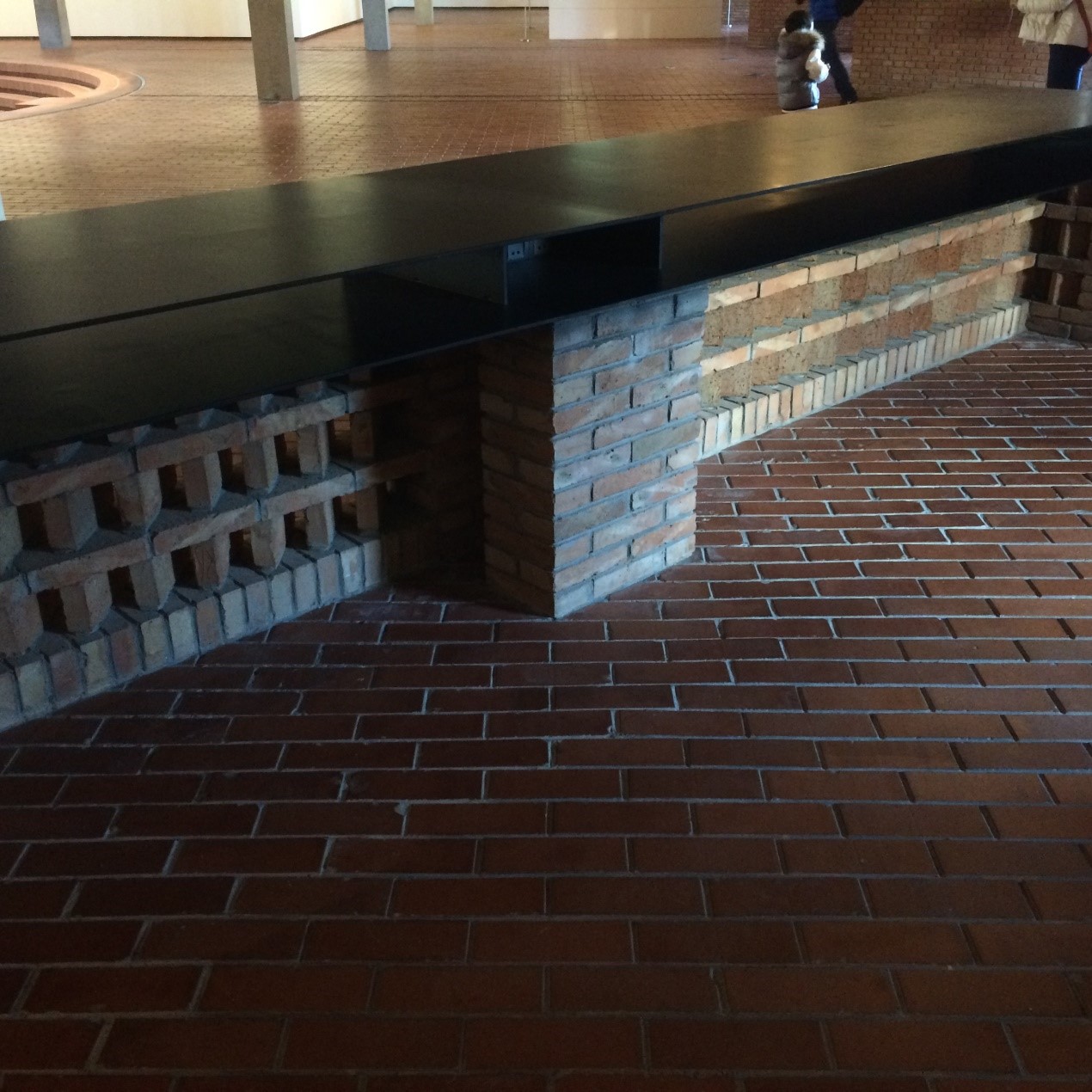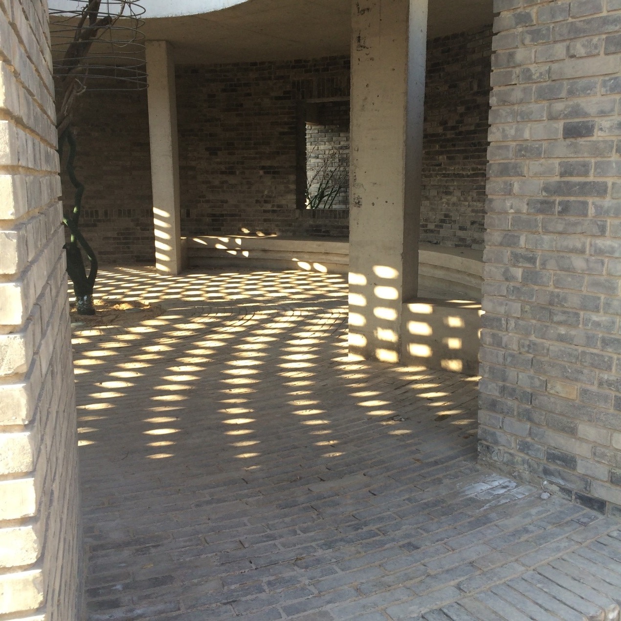 初到这里,并没有一眼找出红砖美术馆,他与周围环境完美契合在暗色调之中,来到美术馆旁,忽然感到赤色的砖块辉映在阳光之中的暖意。在美术馆外的桌椅围栏也是红砖筑成,周围由竹子围住,瞬时坠入有如陶渊明诗句般的意味之中。转身走向入口,入口采用圆的造型与方砖的规矩碰撞,别有一种柔情。正中的玻璃则与红砖材质间的强烈对比,加之室内弱光与室外强光相交杂,来者身形映在玻璃上,戏剧性地好似要走入画框,让人不禁自作多情一番,陡然进入较暗的室内不觉冷却下来,与气氛一同陷入一番深沉。大厅中央是一块下沉的圆形地段,圆心处立一根柱子,顶端用铁链悬着一段金属圆柱,随柱子的旋转的惯性而匀速飞旋,缓慢的速度让我想到了法院的公平,或许这就是如计时器般让我感到一丝无力。尽管那么慢慢的却一直在流逝,没有人知道怎么将它停下。其中四通八达,各个方向都有展厅,通往其他展厅的走廊让我记忆深刻的是一处由纯白渲染的空间与红砖的丰富转化,白色十分干净,眼球受到冲击之感,又好像喝茶之余的一口淡奶油,明亮闯入心房,加以佐味。