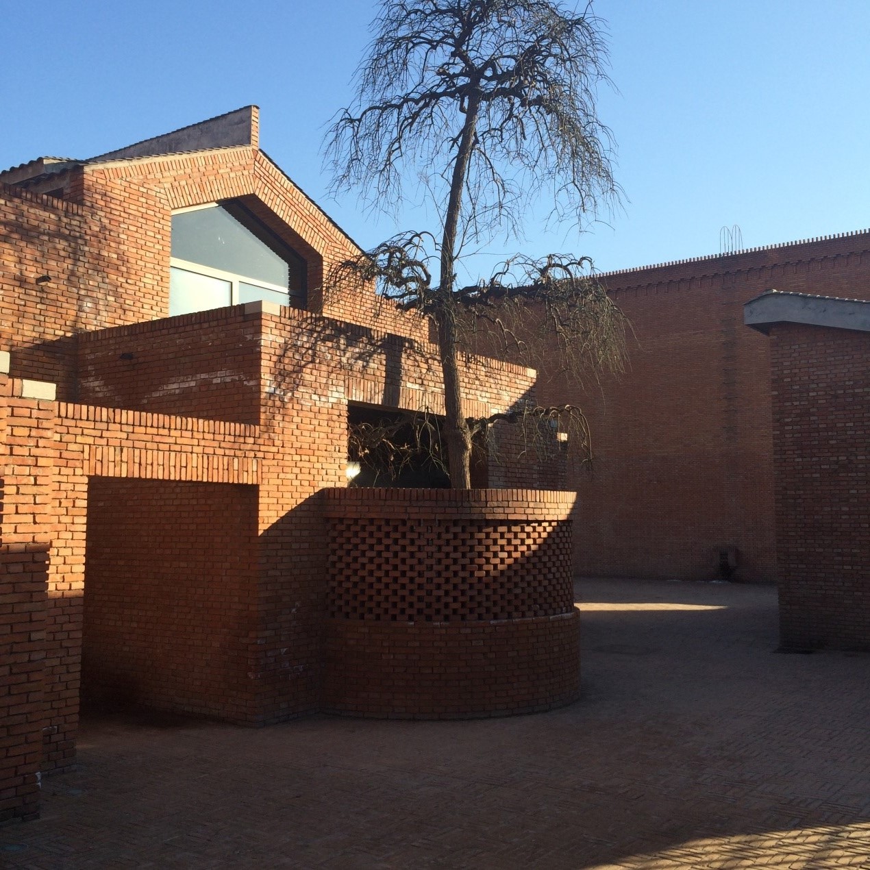 红砖的气氛,光秃的树枝融化在阳光之中