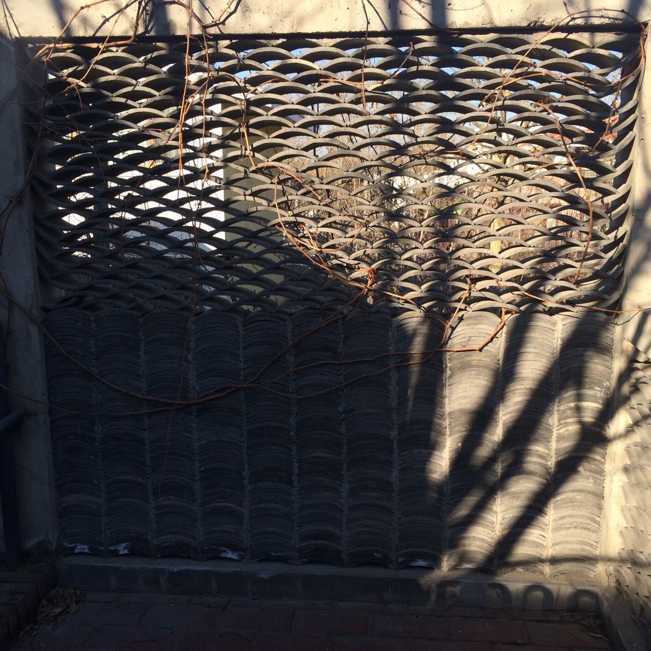 院子的铺地是大量的瓦片,纵横的瓦片像是一出波澜不惊的交响乐,躁动与平静的矛盾相互交融。一处狭窄的过道更是把瓦片用到了极致,下方道路是纵向的瓦片直接插入水中,上置整石块,瓦的弧度与水的质感相呼应,有了“此处无水胜有水”的感受。