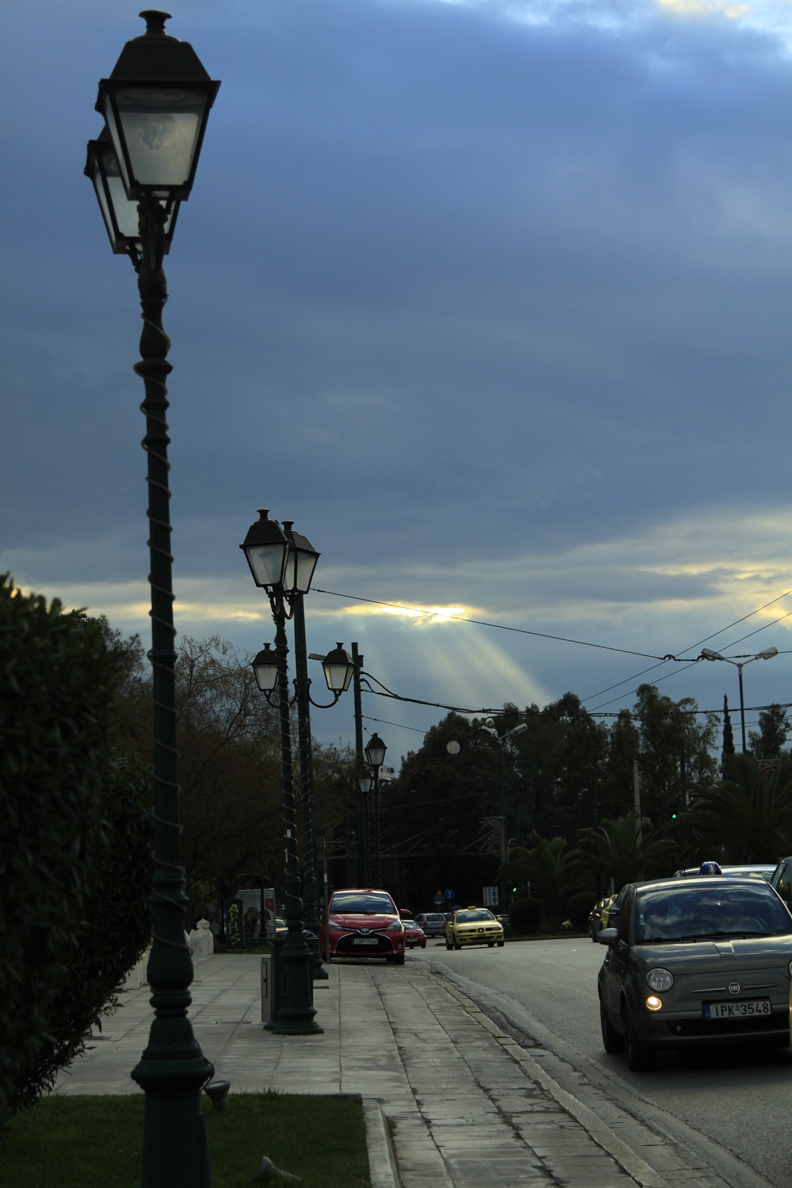 大巴正在行驶在进城高速上。雅典城大部分位于低矮的丘陵地段,海拔会有小幅度起伏,机场通往市区的高速公路多半延半山腰建造,行驶间,可以观赏到雅典城的略景:远处阳光透过云间空隙,犹如一道道光柱射向这座千年古城。城市面积很大,白色的民房成为了城市主体,丘陵的互相掩映,使得雅典城犹如一块起伏的地毯,上面散落着无数白色方块。不同于西班牙马德里,巴塞罗那等大城市,老城与高楼大厦共同成为城市肌理,城市天际线高低起伏,雅典似乎很平整,平缓有序,过渡自然,城区极少有高楼,更多的是集中连片的民宅与商店,卫城是全城的中心也是制高点。