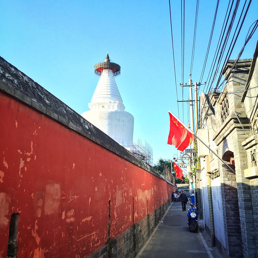 原来有一部在北京台播的纪录片,叫《北京记忆》。这部片子里就出现了下面这张照片的位置。其实阜成门这边,是我上大学之后才常来的,毕竟学校就在西直门,没事的时候骑着车就溜达到白塔寺了。一直到现在我都在思考,生活在白塔寺下面的人,和我们这群生活在鼓楼周围的人,性格会不会有很大的差异呢?我觉得建筑带给人性格上的影响是有可能的。