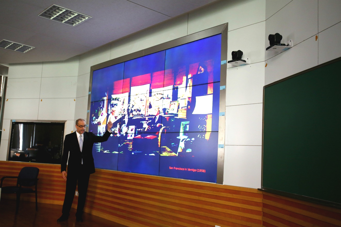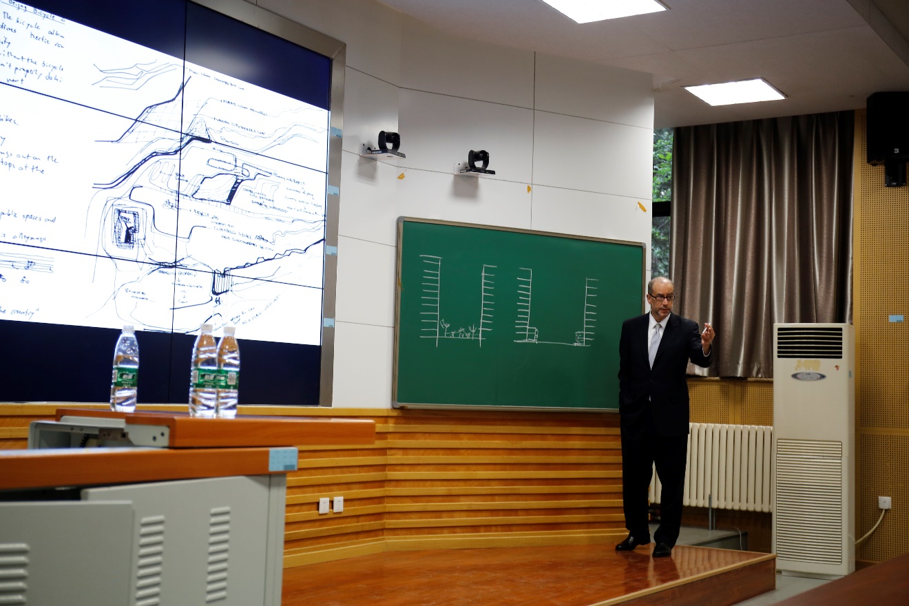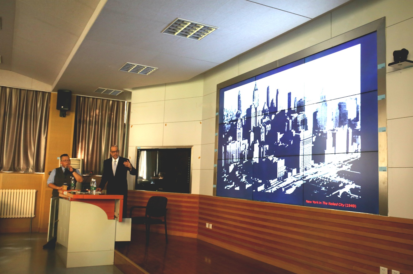 座谈后,罗伊教授在我校三阶举行了一场主题为“电影中的城市”的讲座,并由钱睿进行现场翻译。罗伊教授将他在密歇根大学城市设计研究生项目开设的课程——以电影为教学媒介的设计课,与大家进行了分享和交流。罗伊教授之所以在设计课中播放电影,是因为他认为电影的叙事和表达方式能够帮助城市设计的初学者很好地感知和理解城市形态与社会生活的存在状态与交叠方式,而这正是城市设计师在进行创作时应着重关注的部分;此外,镜头捕捉城市的方式也是十分多样的,从鸟瞰一座城市的某片区域微观到某一幢建筑或某一条小巷,这些恰好是城市设计师进行实践的范围和对象。