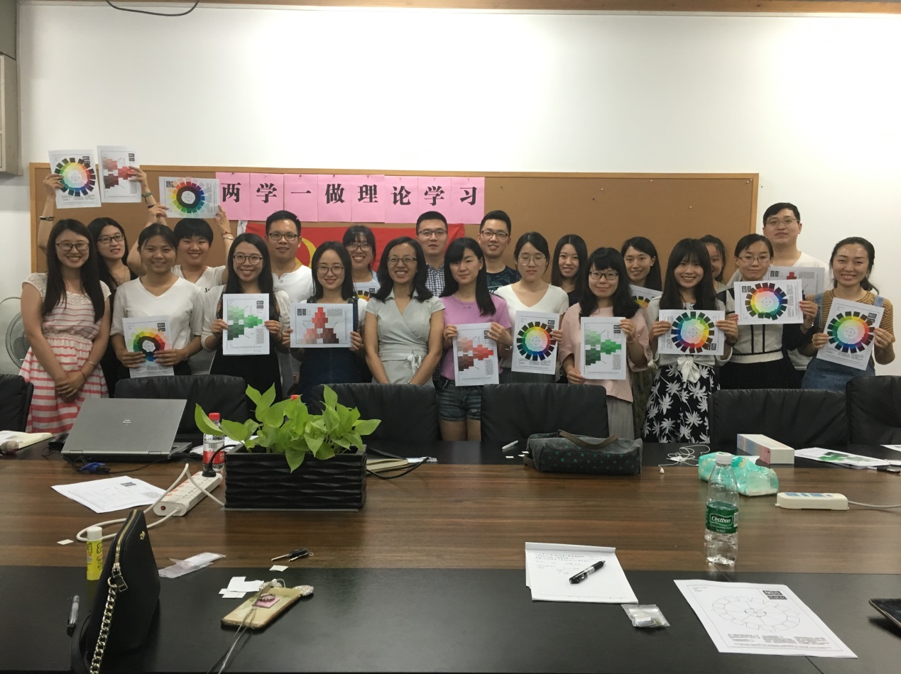6月16日,设计学研究生党支部“两学一做”理论学习如期展开,理论导师阚玉德为学生党员进行了一场别开生面的分享。阚老师进行了专业理论知识的讲解——色彩的世界,带领大家进入了“NCS的色彩世界”。阚老师从色彩的历史开篇,让大家了解色彩如何起源,色彩设计中的舒适的配比值,以及色彩带给人的心理感受,同时了解了不同的色彩体系及其原理关系和一系列派生产品。为了加深对色彩的感觉,阚老师带着大家做起了贴色环的游戏。颜色的变化有无穷的魅力,由浅到深,由黑到白,展现了色彩的彩度、黑度、白度。色环中色值环环相扣,缺一不可,色度表中彩度、黑度、白度三个方向循序渐进。随着游戏的深入,难度也随之加大,有时会有将色卡贴串行等错误,但阚老师及时发现并纠正了这些错误。在本次的色彩练习中,大家互相交流,互相学习,不止学习了理论知识,还增进了支部的联系,同时也受到了色度和色环中循序渐进精神的启发,告诉大家在生活和学习中也要稳扎稳打。
