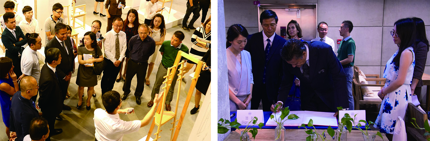 展览开幕式结束后,与会人员共同参观了展览。领导、嘉宾欣然在努努影视 关于传统家具技艺、传统木雕技艺学术出版物上赠言题字,与作品设计师生进行了交流和探讨。
