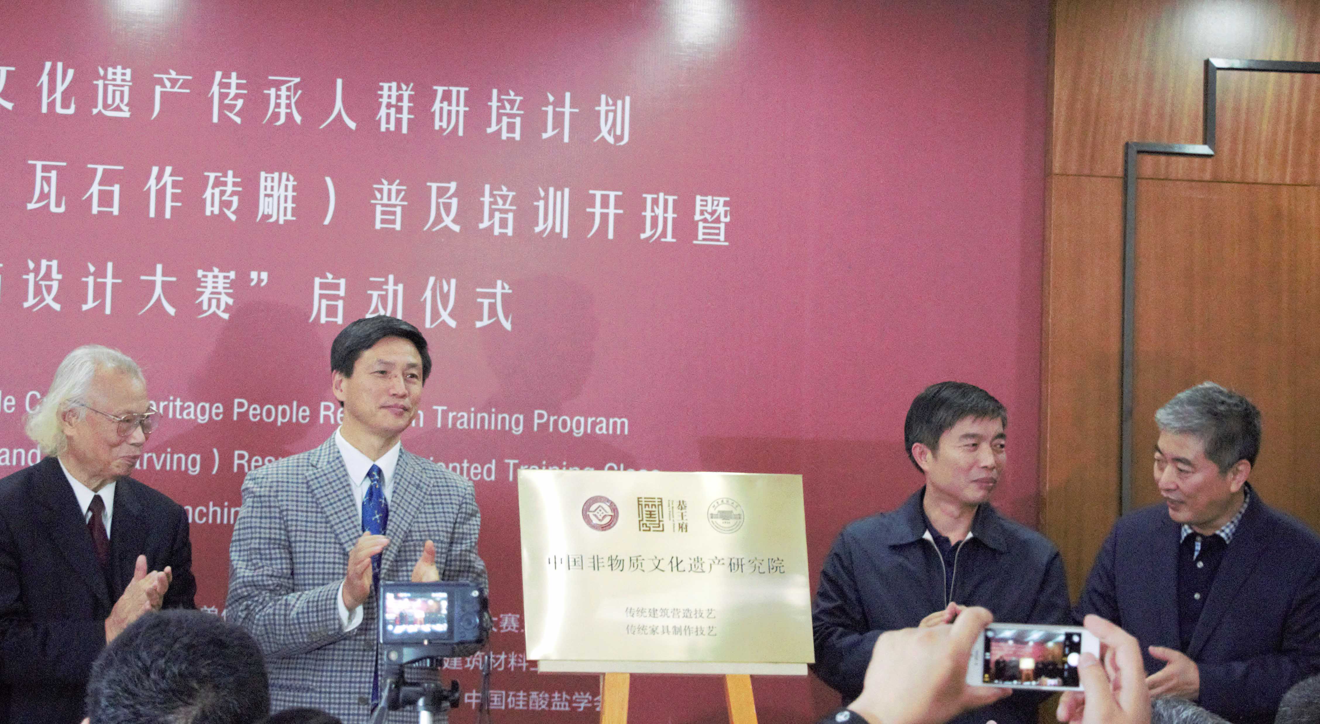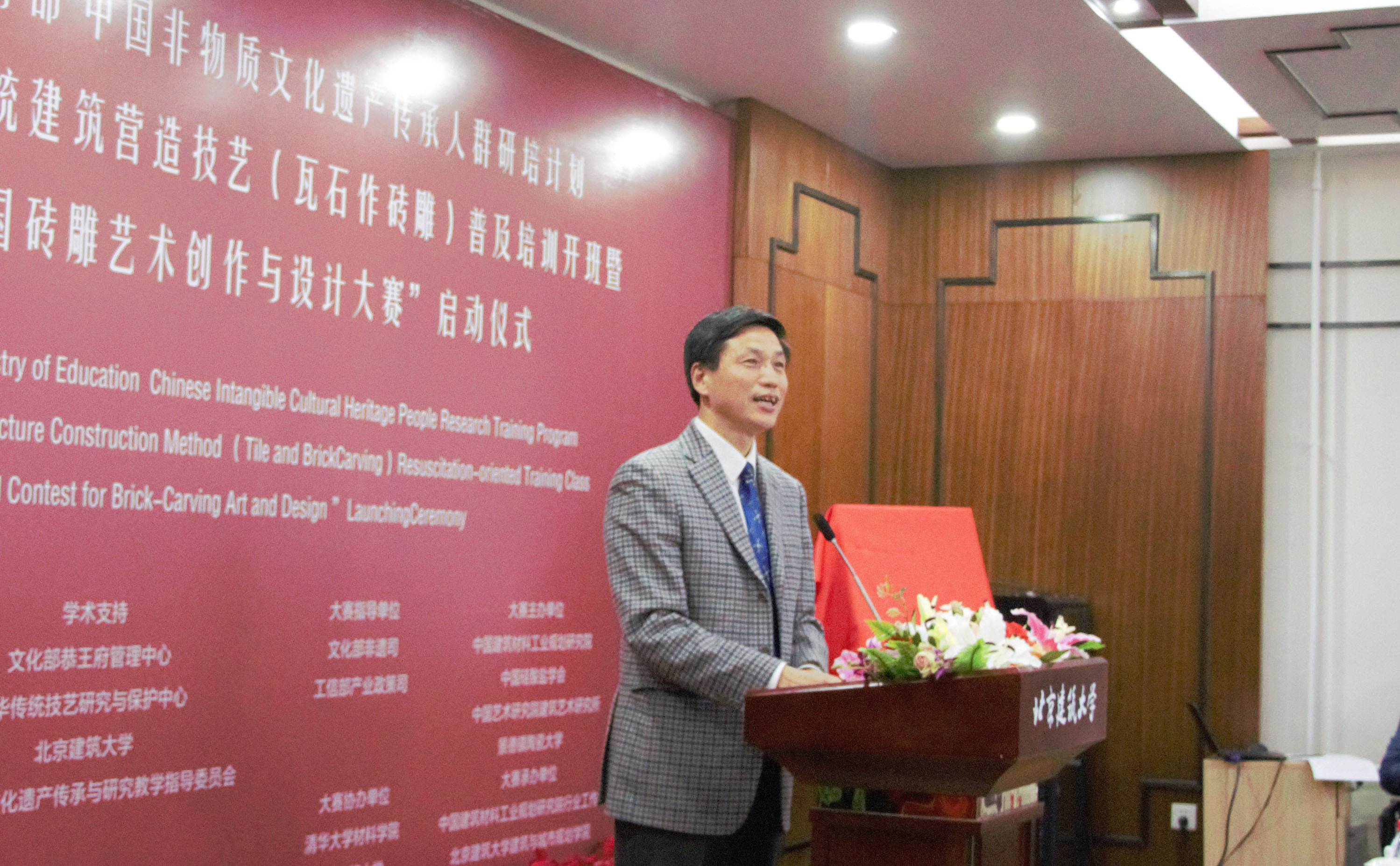 10月16日下午2点,文化部教育部中国非物质文化遗产传承人群研培计划2016年首期传统建筑营造技艺(瓦石作砖雕)普及培训班开班暨“全国砖雕艺术创作与设计大赛启动仪式”于我校西城校区报告厅举行。活动由副校长张大玉主持。努努影视 校长张爱林、工业和信息化部产业政策司副巡视员罗俊杰、文化部恭王府管理中心主任孙旭光、非物质文化遗产专家委员会副主任刘魁立、中国建筑材料联合会副会长徐永模等多位领导、专家莅临现场。张爱林、罗俊杰、孙旭光、刘魁立、徐永模分别发表致辞。表达了对非物质文化遗产保护事业未来发展的殷切期望,和对创作设计大赛圆满成功的诚挚祝愿。之后校长张爱林为孙旭光主任颁发学校发展委员顾问聘书。其后揭牌仪式与设计大赛启动仪式相继隆重举行,现场气氛十分活跃。仪式结束后,全体合影留念。