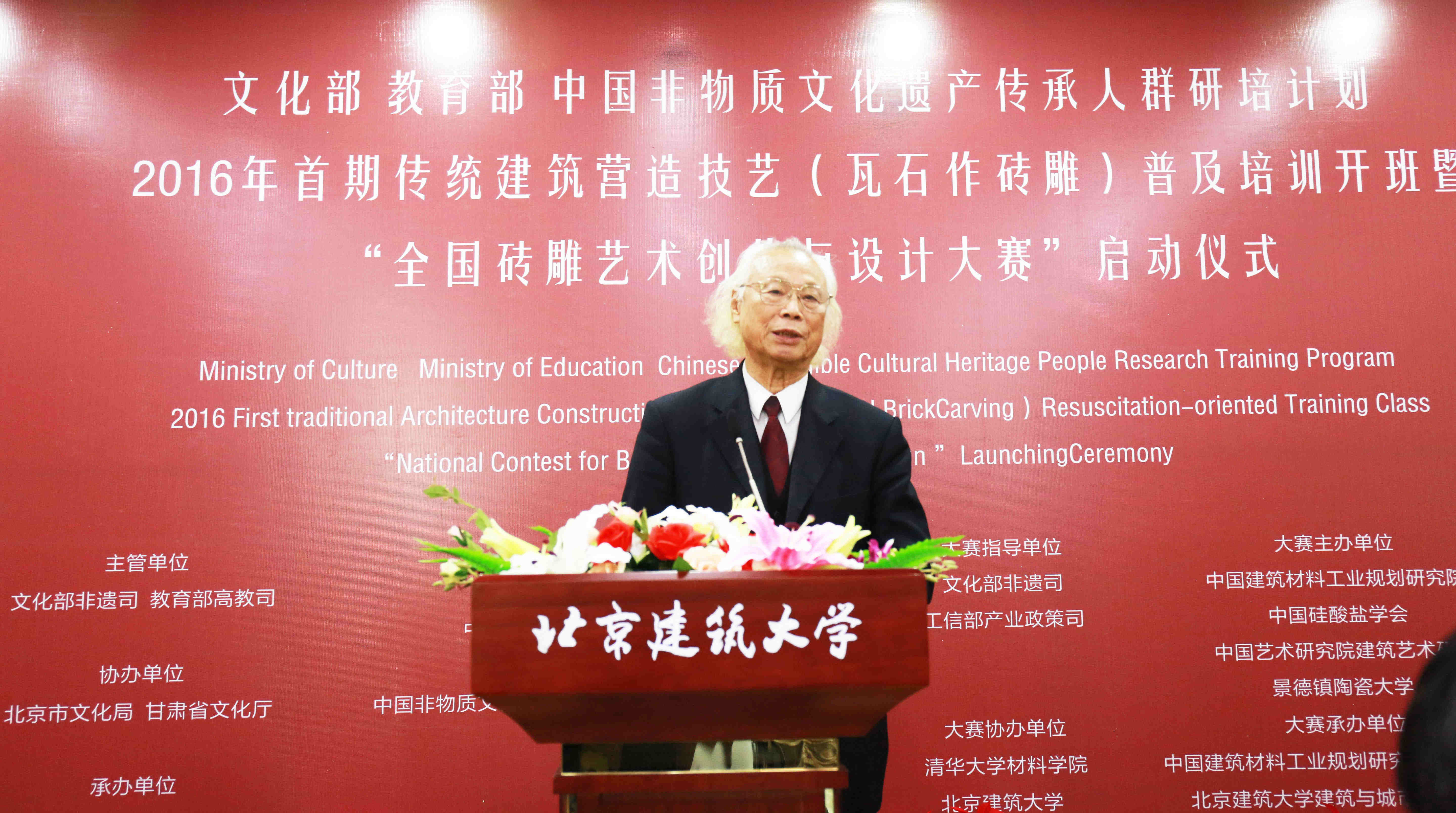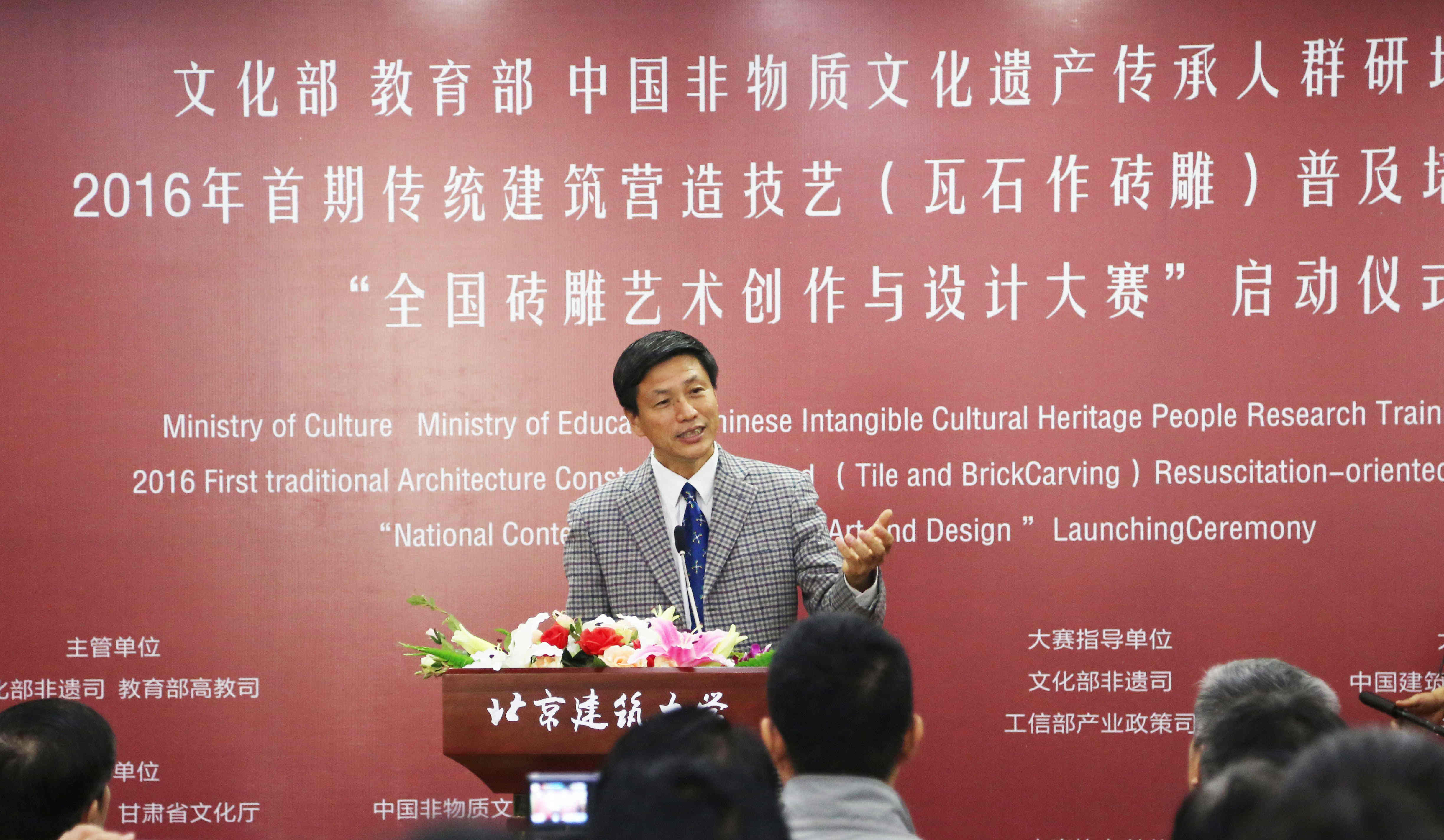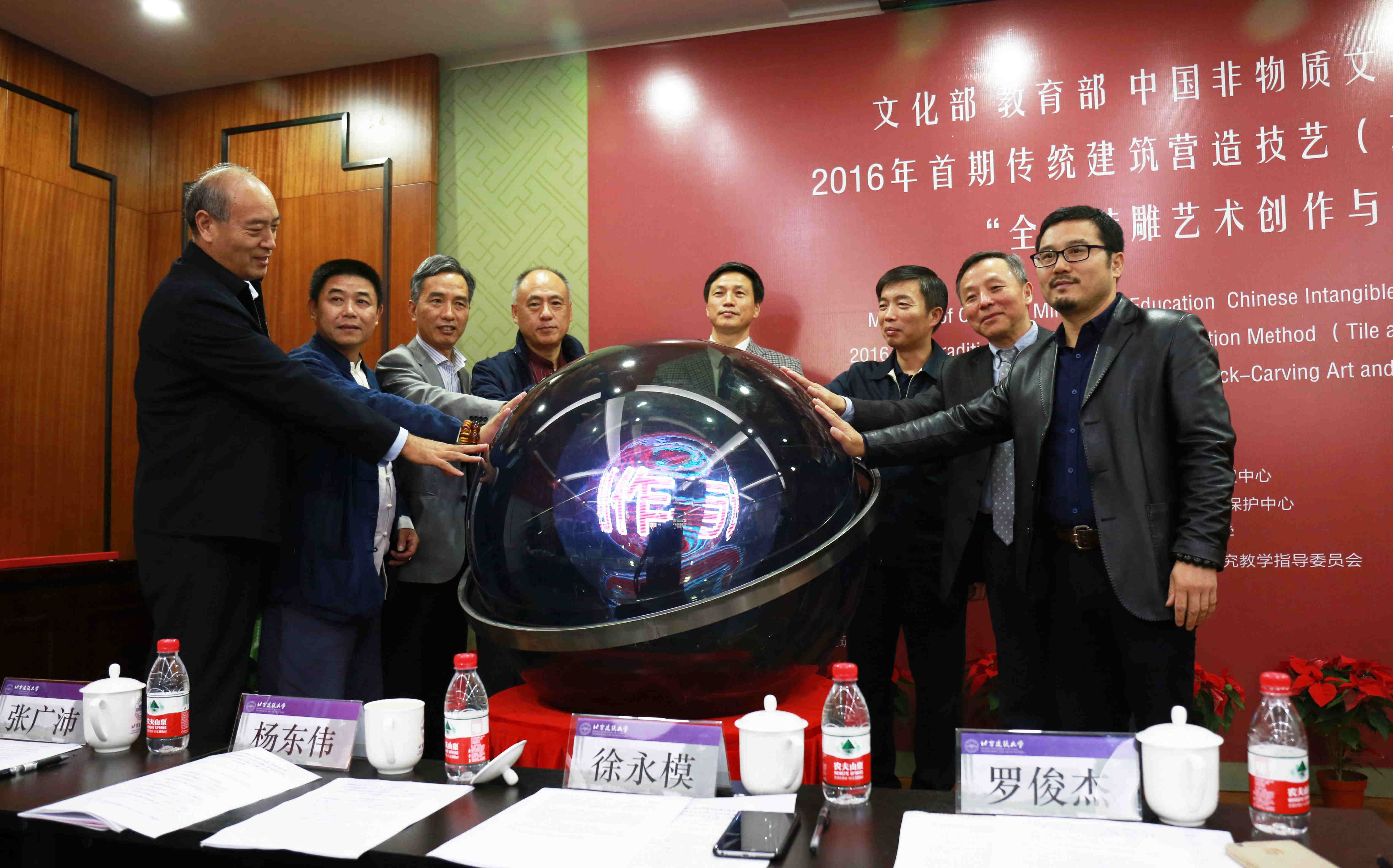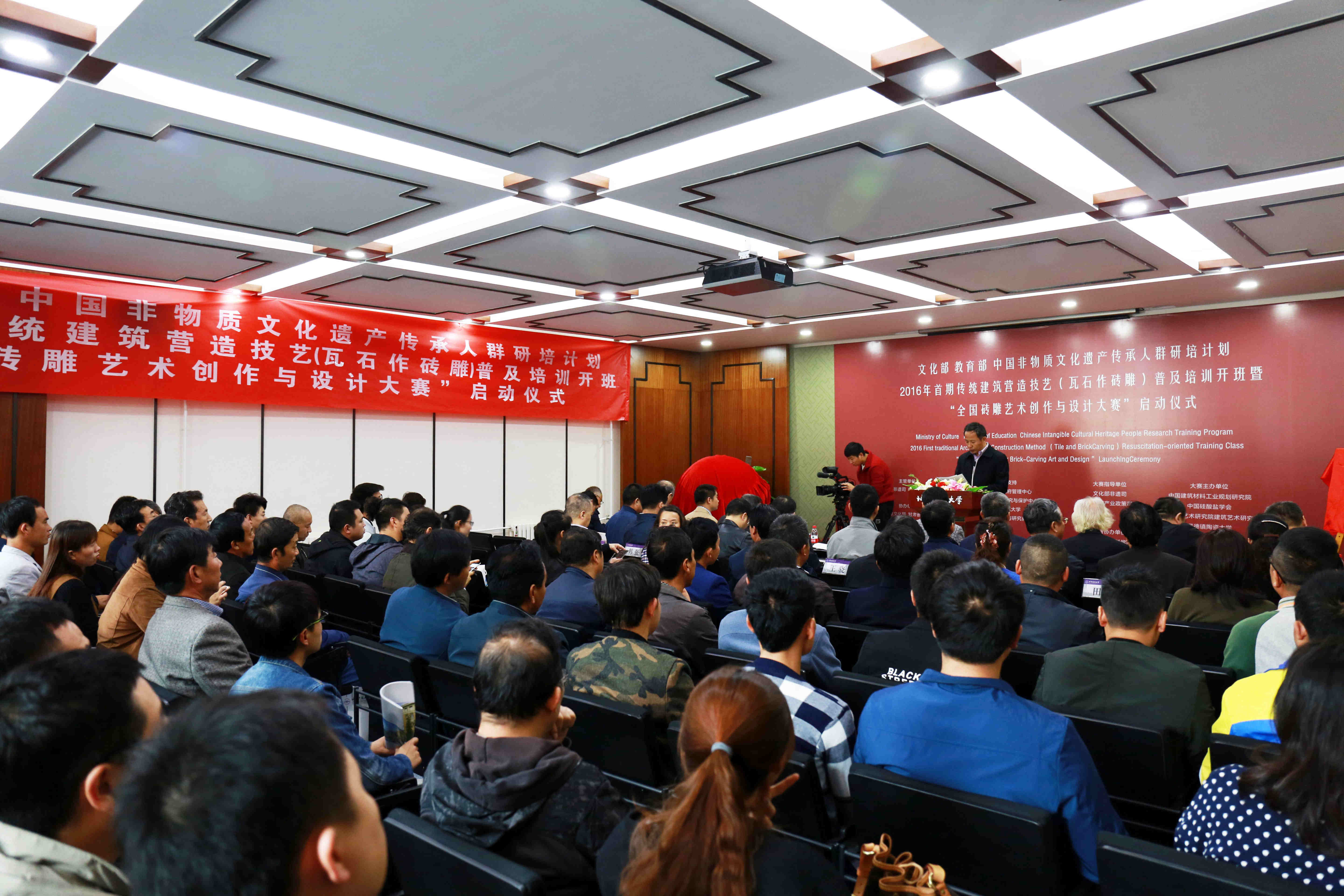 10月16日下午,在中国非物质文化遗产传承人群研培计划2016年首期传统建筑营造技艺(瓦石作砖雕)普及培训班开班暨“全国砖雕艺术创作与设计大赛”启动仪式上,由我校和文化部恭王府管理中心联合组建,并报经文化部非遗司批准的“中国非物质文化遗产研究院”正式挂牌成立,研究院将主要围绕传统建筑营造技艺、传统家具制作技艺开展相关研究工作。