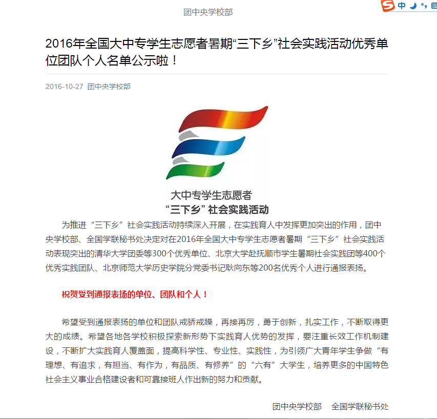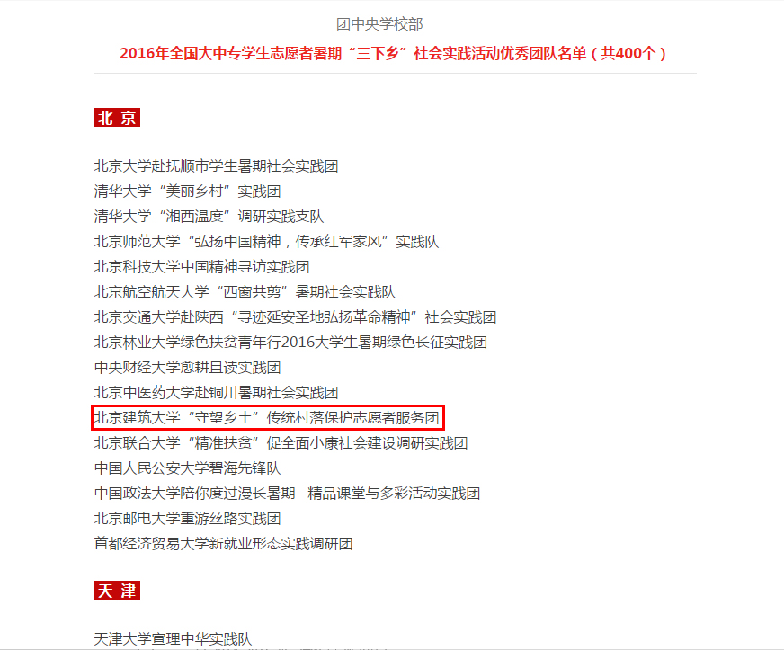 10月27日,从共青团中央、全国学联传来喜讯,努努影视 “守望乡土”传统村落保护志愿者服务团队获评2016年全国大中专学生志愿者暑期“三下乡”社会实践活动优秀团队!北京地区共有15所学校的16支实践团队获此殊荣。