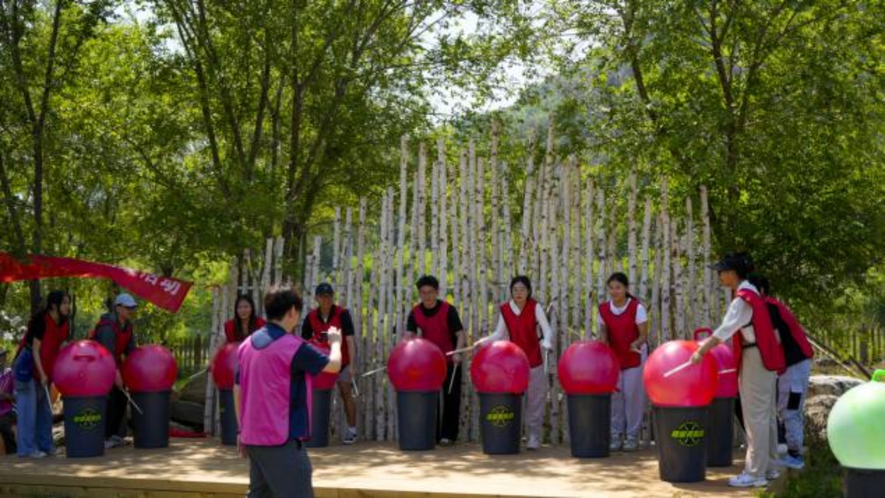 在素拓教练的组织和指导下,同学们迅速投入到紧张而有趣的拓展项目中。首先进行的是《超级有氧鼓》项目体验。在教练的引导下,同学们分组协作、共想队名,随着节奏的起伏,手持鼓棒敲打出激昂的鼓点。这不仅是一场音乐的盛宴,更是一次团队协作的考验。大家在鼓声中释放压力,亲近自然,愉悦身心,迅速拉近了彼此之间的距离。