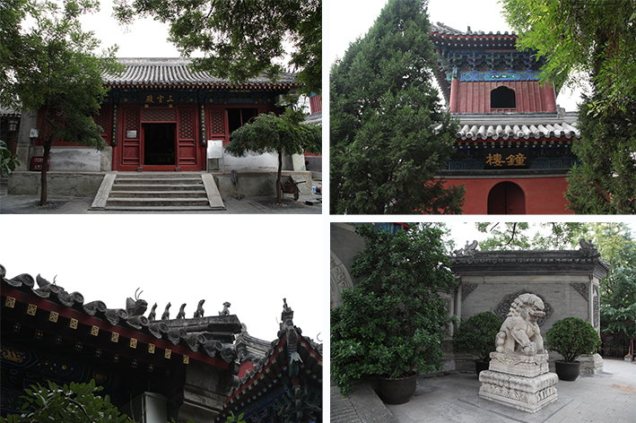 至观内中路的见殿宇,多数殿宇奉祀着各路仙人,名仕,邱祖殿、三清四御殿、三官殿、财神殿、玉皇殿、救苦殿、药王殿、老律堂等皆为此类。其中邱祖殿,奉祀全真龙门派始祖长春真人邱处机。殿内正中摆放着一个巨大的“瘿钵”,系古树根雕制而成。此钵为清朝雍正皇帝所赐。传说观内道士生活无着落时,可抬着此钵到皇宫募化,宫中必有施舍。邱处机的遗蜕就埋藏于此“瘿钵”之下。而三清四御殿,为二层阁楼,上层奉三清,下层奉四御。三清像为明朝宣德年间所塑造,高2米余,神态安详超凡,色彩鲜艳如初,富丽而又不失古朴。四御即辅佐玉皇大帝的四位天帝:勾陈上宫天皇大帝、南极长生大帝、中天紫微北极大帝和后土皇地祇。此些皆为清代中期泥塑金漆沥粉造像,高约1.5米。殿前院子中的鎏金铜鼎炉,为明嘉靖年间所铸造。香炉造型浑厚,周身雕铸着精美的云龙图案,共有43条金龙。旁有三官殿供奉着奉祀天、地、水“三官大帝”。意为天官赐福,地官赦罪,水官解厄。财神殿,顾名思义,供奉三位财神,中春神青帝,左财神赵公明,右武财神关羽。奉祀玉皇大帝的玉皇殿,殿内神像威武,壁画精致,亦值得一看。救苦殿奉祀太乙救苦天尊,据道经说:太乙救苦天尊是天界专门拯救不幸堕入地狱之人的大慈大悲天神。药王殿,奉祀唐代著名道士、医学家孙思邈。他著有《千金要方》、《千金翼方》等多种著作,在中国医学和药物学方面做出了极大贡献,因而被后世尊称为药王。最后,老律堂原名七真殿。供奉全真七子,即全真派祖师王重阳的七大弟子:中座为邱处机,左边依次为刘处玄、谭处端、马钰,右座依次为王处一、郝大通、孙不二。每天早晚道士们都要来到这里上殿诵经,逢道教节日或祖师圣诞,要在这里设坛举行斋醮法会。众多殿宇个个精美,不可言状,今日入观者亦皆叹服于其体势庞伟,匠工精良。